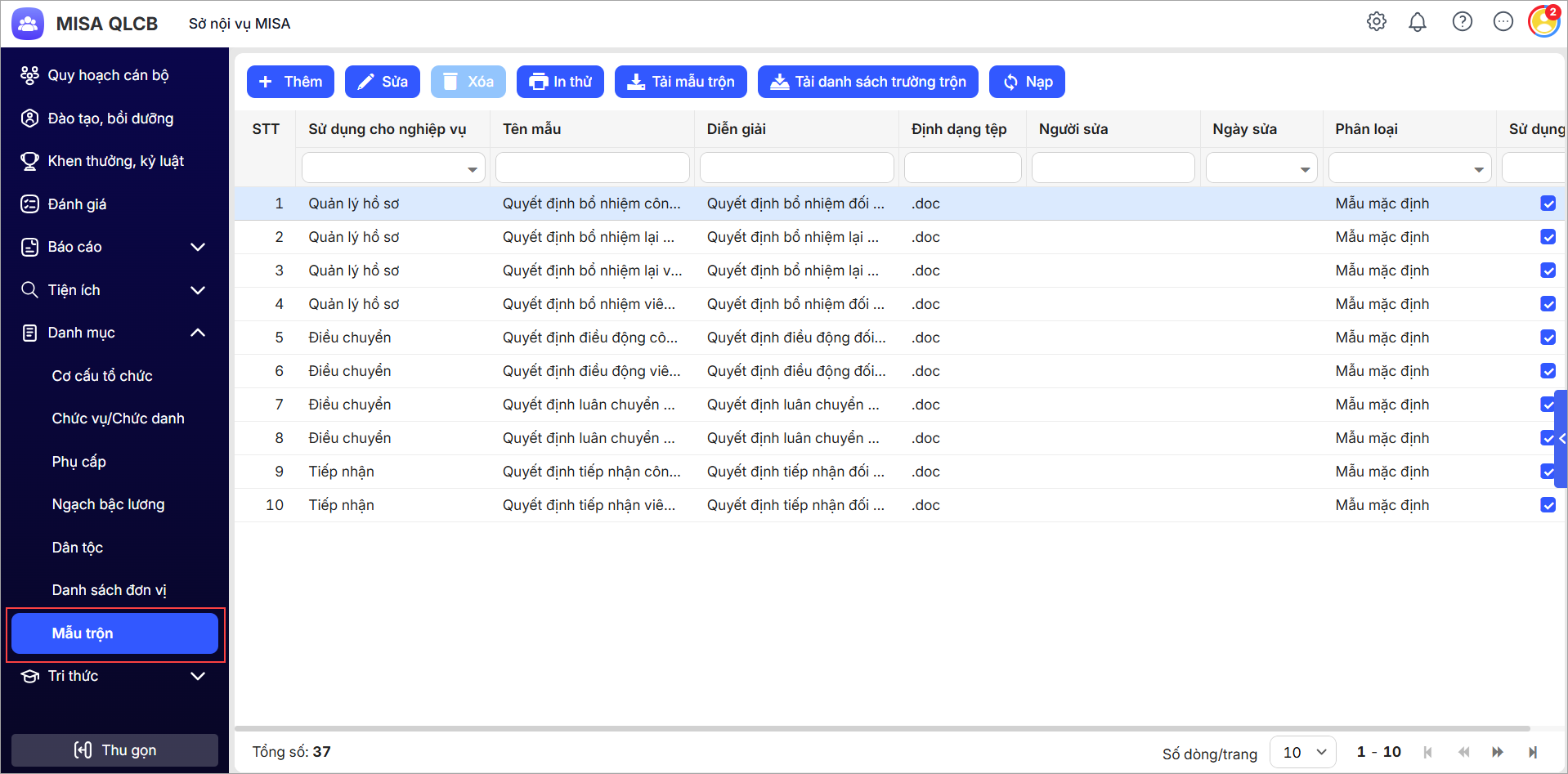 Phần mềm đã mặc định sẵn danh sách các mẫu trộn, anh/chị có thể tải mẫu trộn, danh sách trường trộn để chỉnh sửa lại theo đúng thực tế tại đơn vị, sau đó lưu thành mẫu mới và sử dụng. Cách chỉnh sửa mẫu trộn như sau: