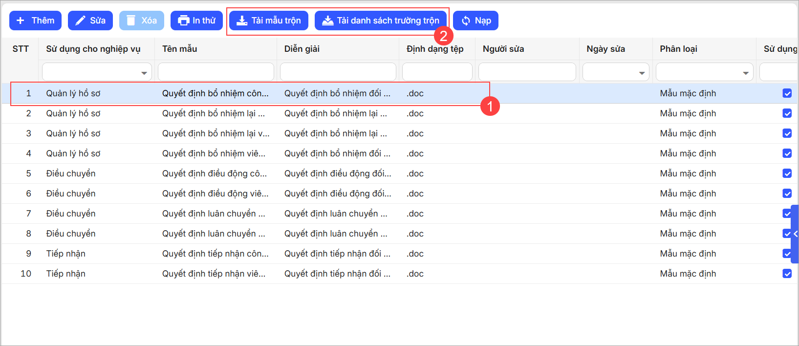 2. Chọn mẫu trộn cần sửa trên danh sách, nhấn Tải mẫu trộn hoặc Tải danh sách trường trộn.