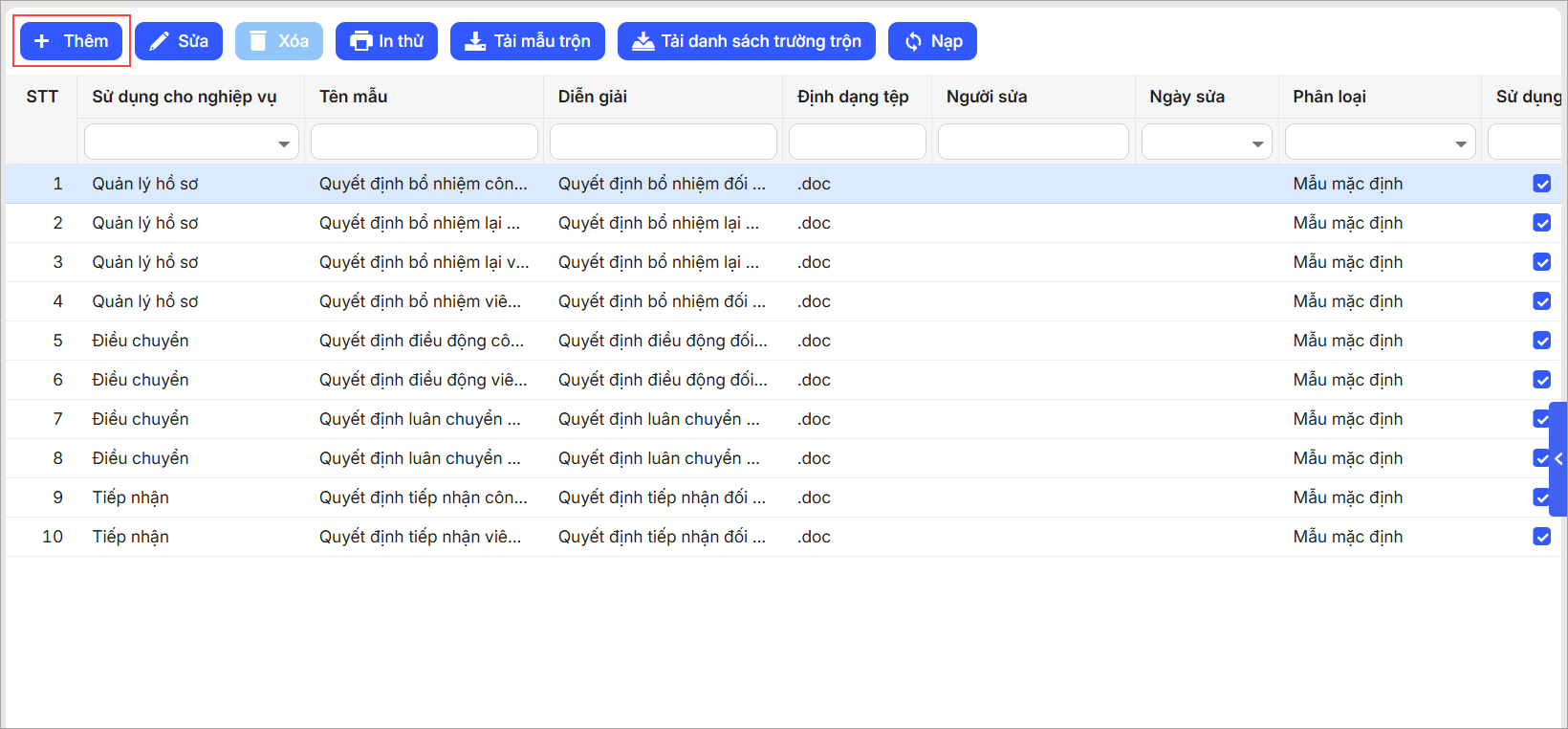 - Để mẫu có hiệu lực, giữ tích ✓ ở ô “Sử dụng”.