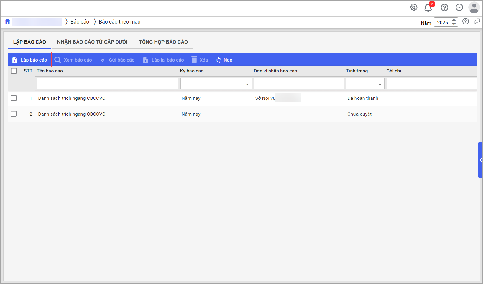 - Sau khi đăng nhập vào phần mềm sẽ hiển thị thông báo nhận báo cáo từ đơn vị cấp dưới, anh/chị nhấn vào để xem chi tiết. Hoặc vào Báo cáo\Xem báo cáo theo mẫu, mục Nhận báo cáo từ cấp dưới.