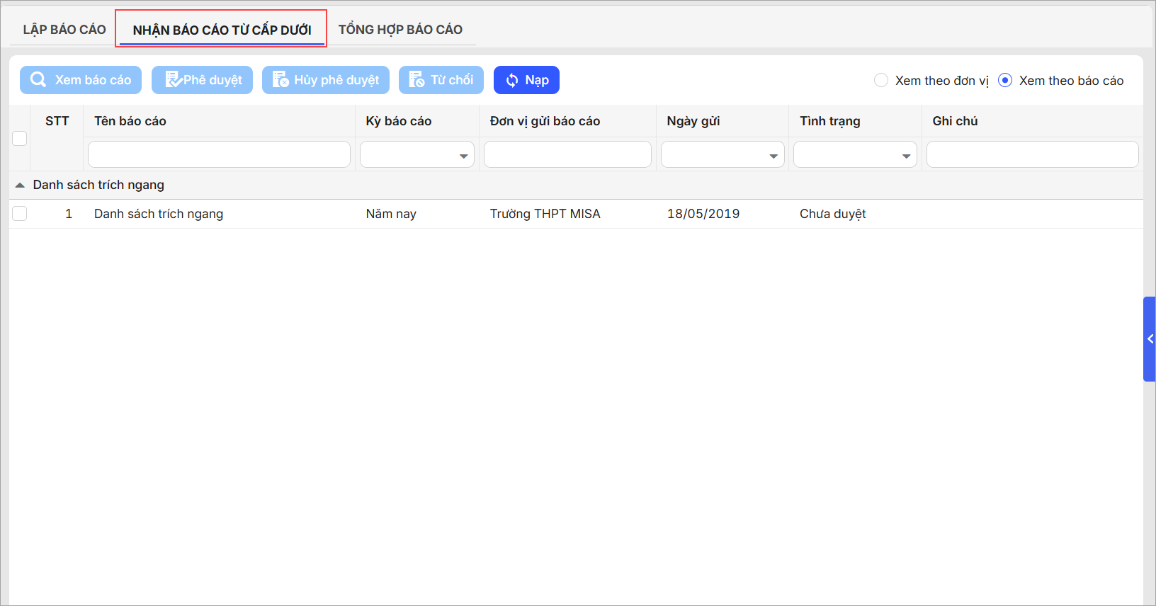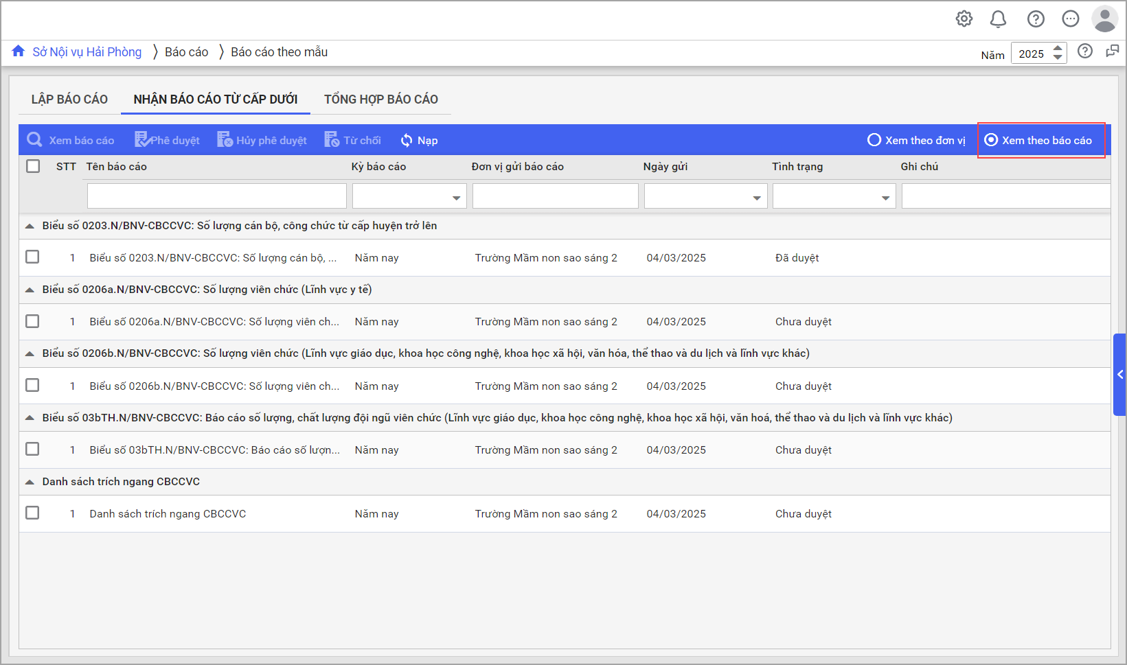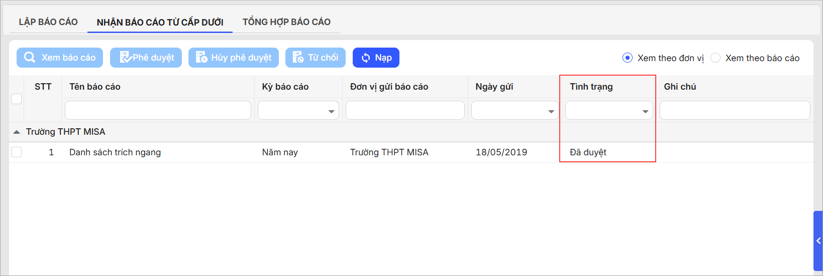 Các báo cáo sau khi phê duyệt sẽ có trạng thái là Đã duyệt. Đơn vị cấp dưới có thể xem được tình trạng báo cáo là Đã duyệt hay chưa.