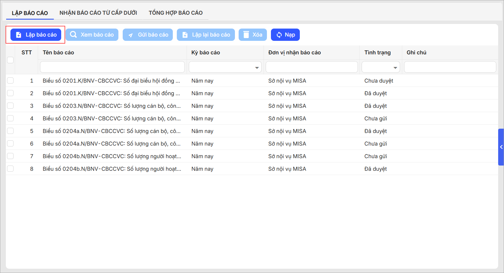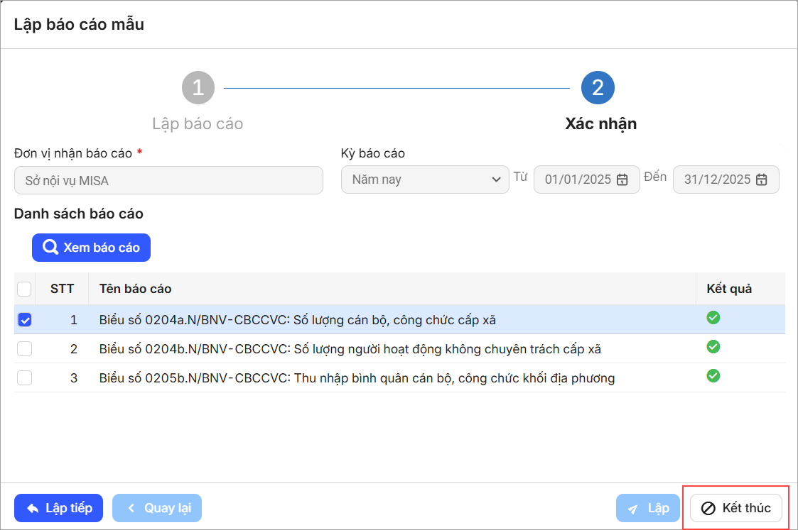 - Anh/chị có thể Xem báo cáo đã chọn, nhấn Lập để lưu.