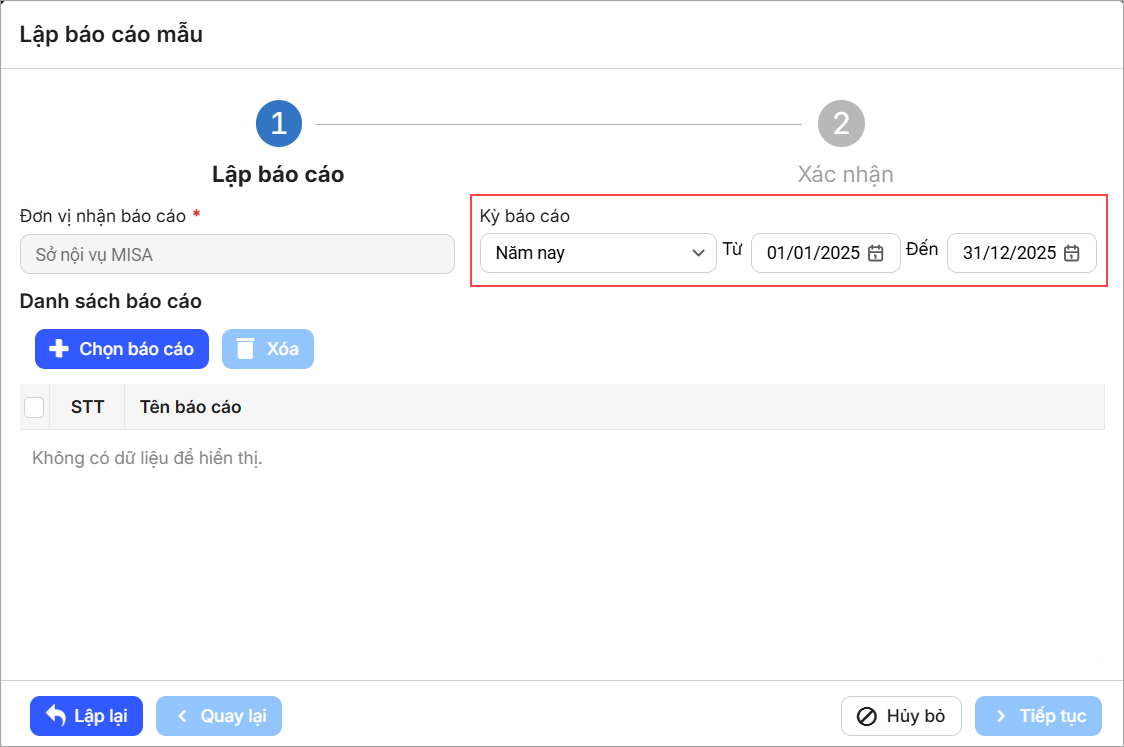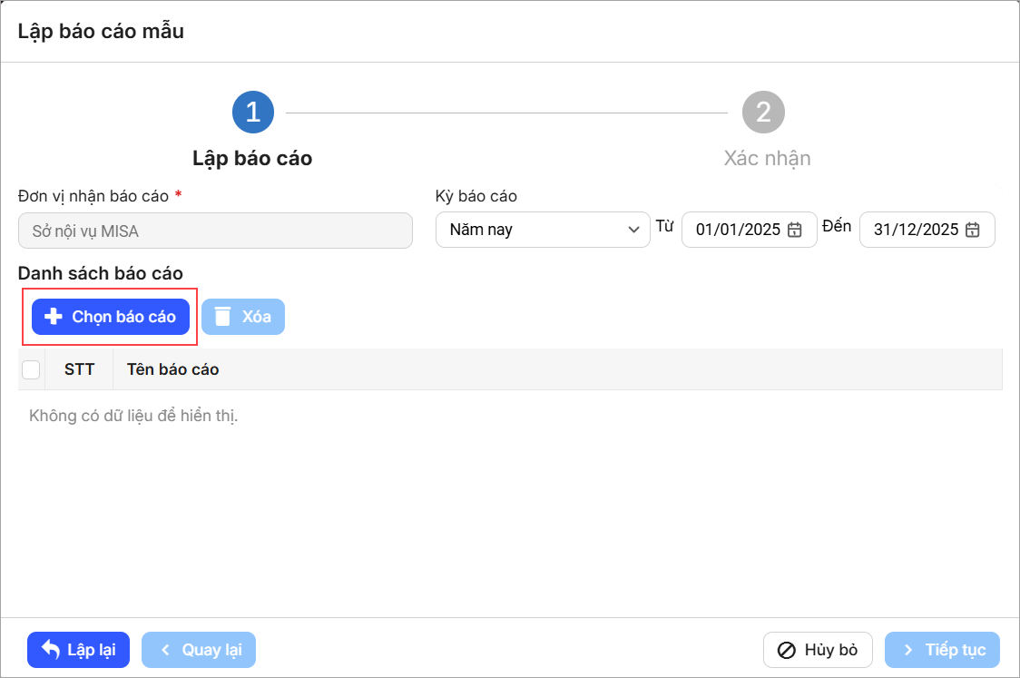 - Để lập báo cáo mẫu, chọn Lập báo cáo.