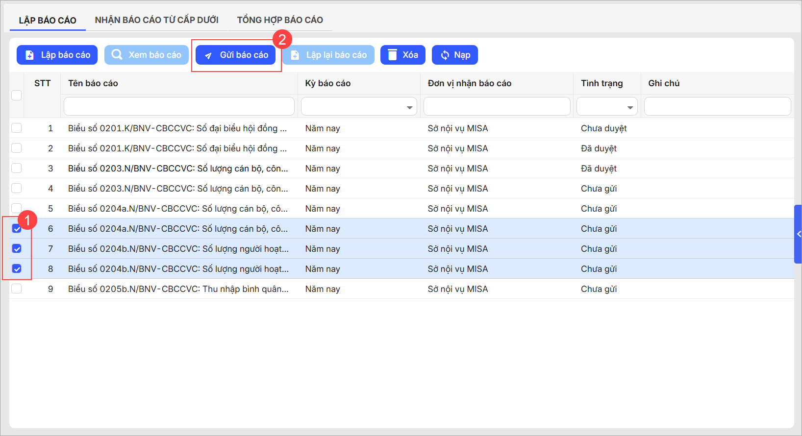 - Phần mềm sẽ lấy lên danh sách báo cáo và trạng thái Chưa gửi/Chưa duyệt/Đã duyệt. Để gửi cấp báo cáo chủ quản, anh/chị chọn báo cáo trên danh sách, nhấn Gửi báo cáo.