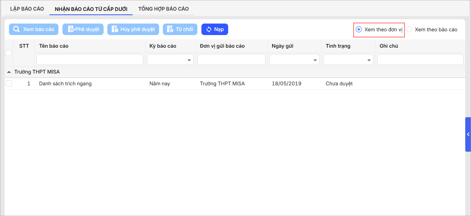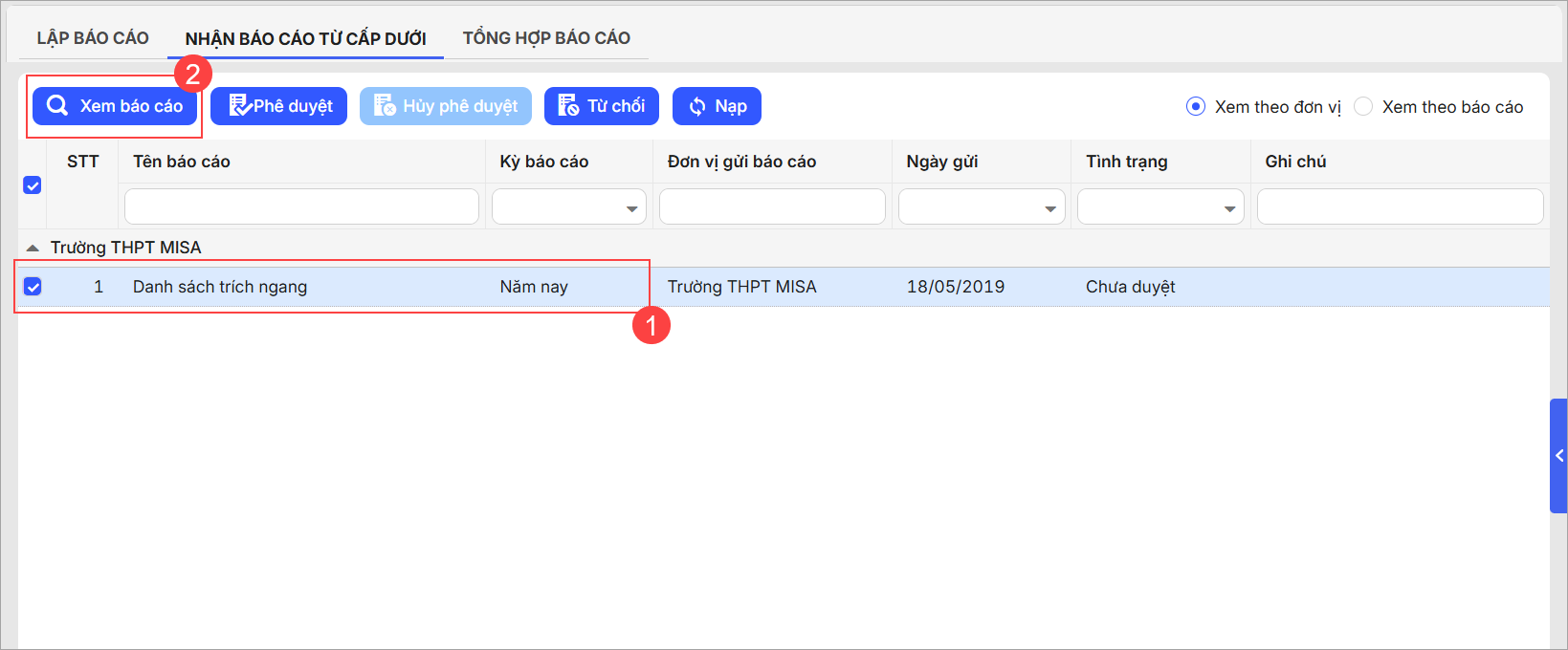 - Cán bộ tổ chức đơn vị chủ quản có thể lựa chọn xem báo cáo từ đơn vị cấp dưới gửi Theo đơn vị