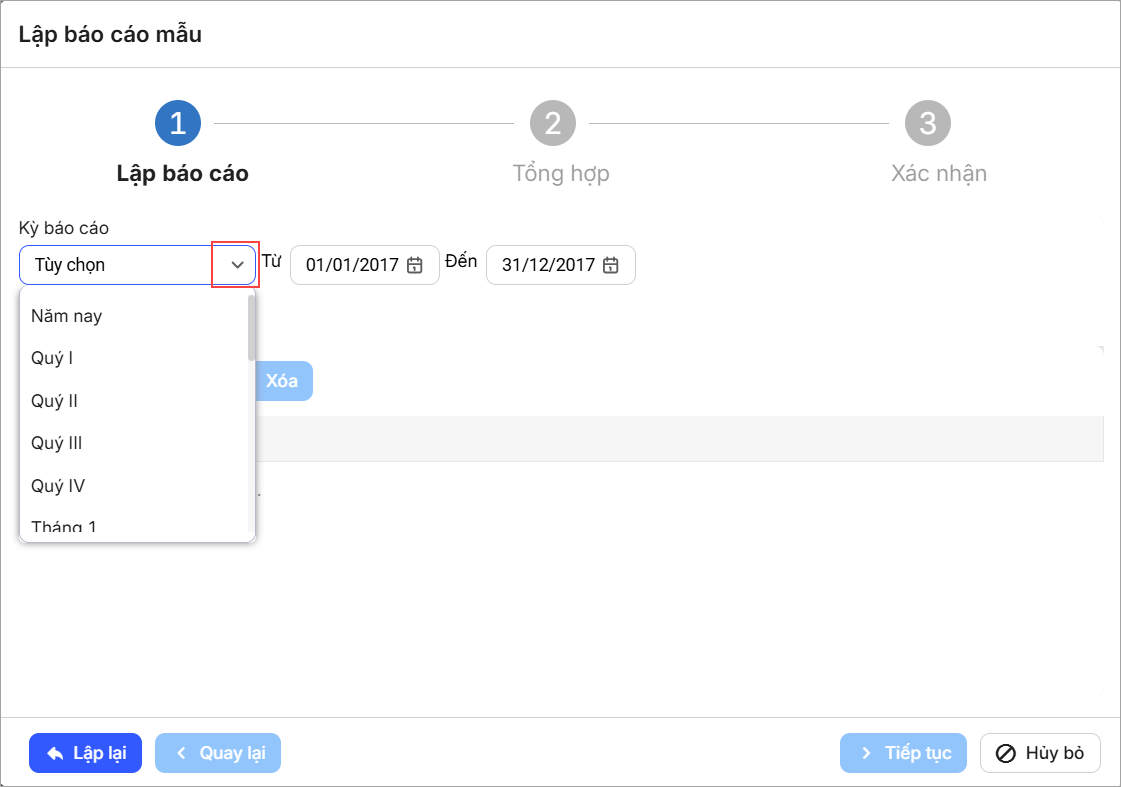Chọn Kỳ báo cáo. Phần mềm mặc định năm của kỳ báo cáo là năm hiện tại anh/chị có thể chọn lại kỳ báo cáo theo tháng/quý/6 tháng/tùy chọn.