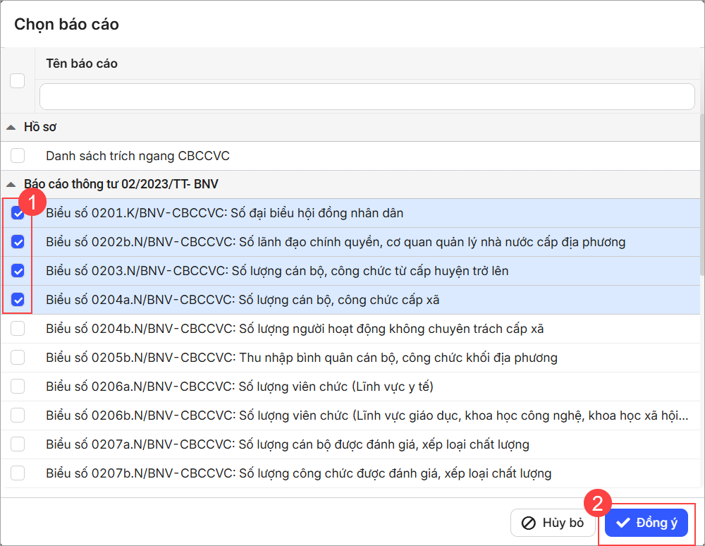 - Tích chọn báo cáo được cấp chủ quản yêu cầu, nhấn Đồng ý.