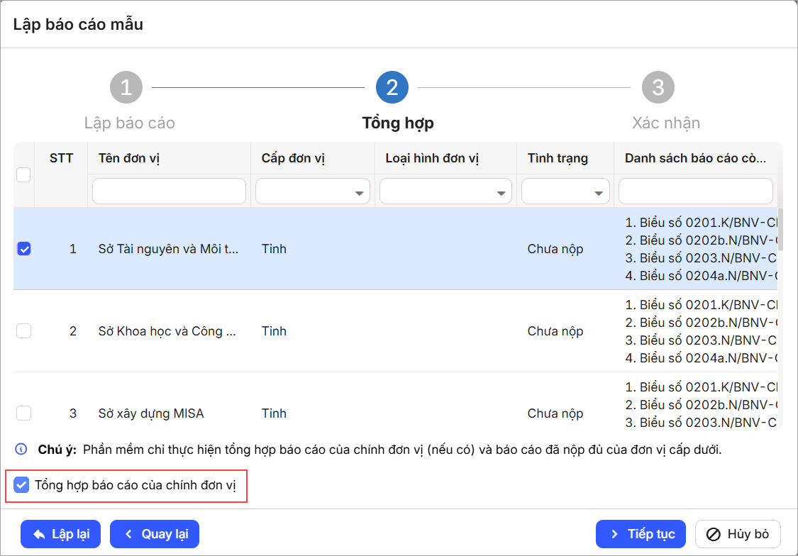 Đồng thời, có thể tích chọn Tổng hợp báo cáo của chính đơn vị hay không. - Nhấn Tiếp tục để chuyển sang bước Xác nhận. Nhấn Lập & Gửi để lập và gửi báo cáo cho cấp trên.