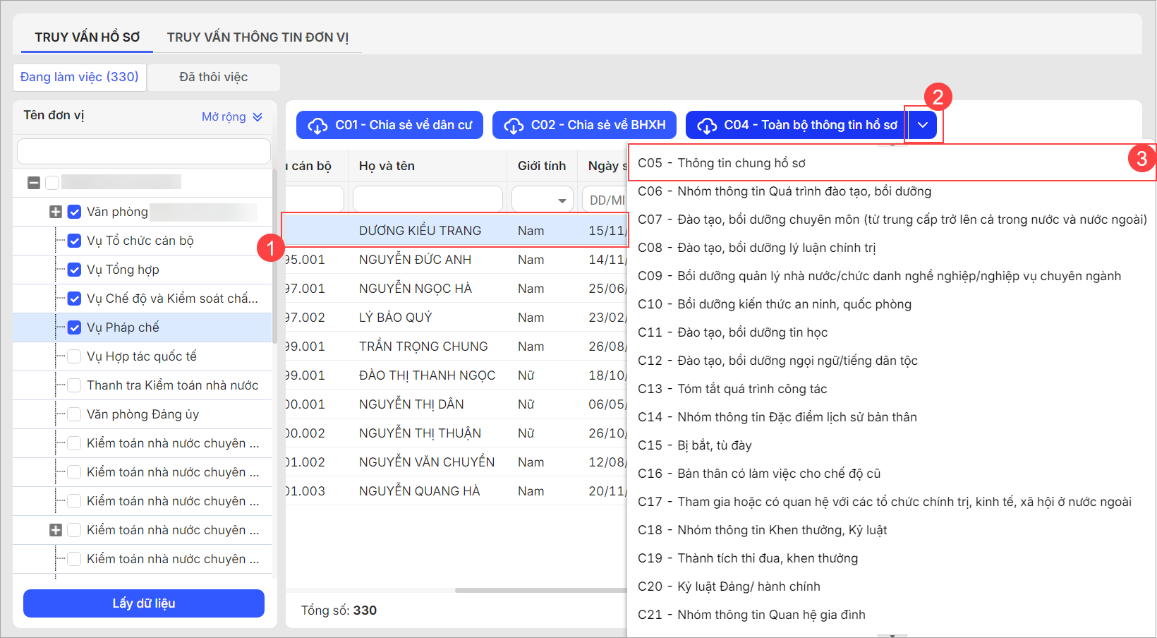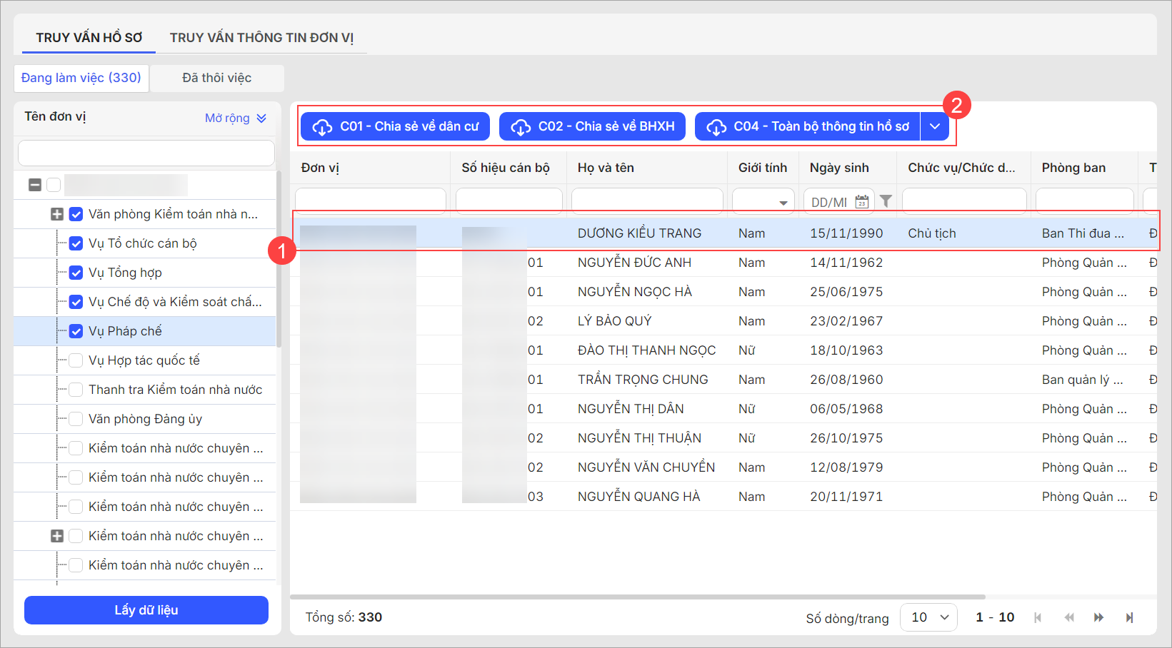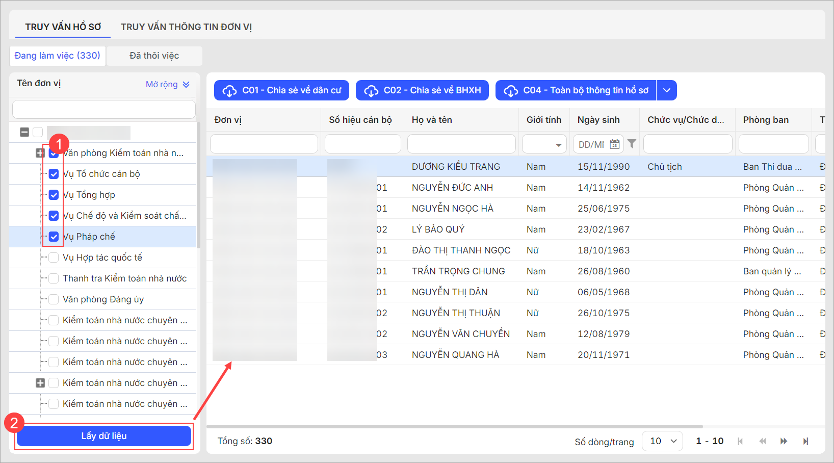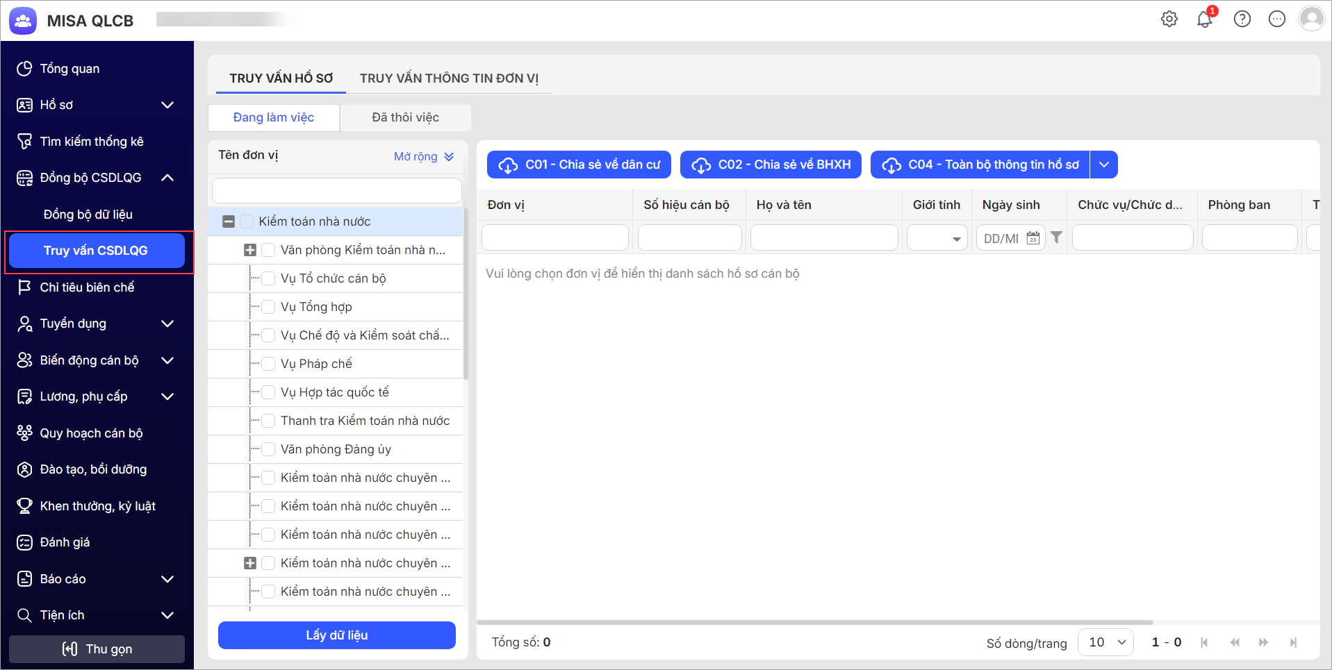 2. Tại tab Truy vấn hồ sơ, tích chọn đơn vị chứa cán bộ mà anh/chị muốn tra cứu thông tin, chọn Lấy dữ liệu để hiển thị danh sách cán bộ trong đơn vị đó