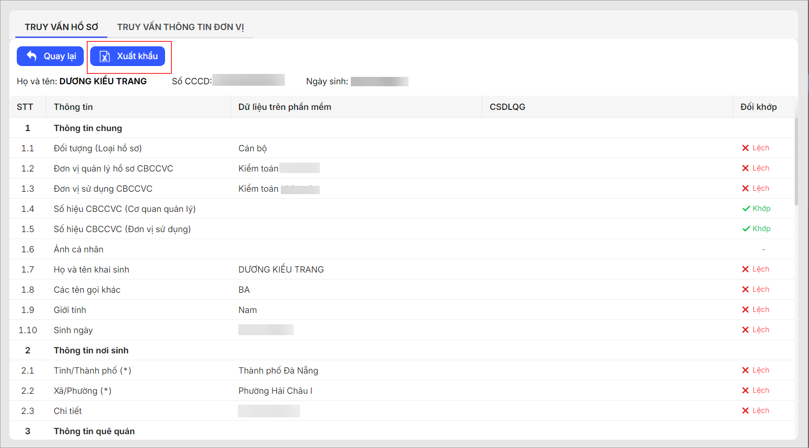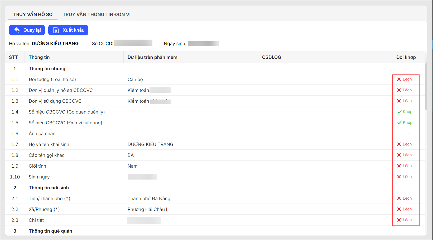 5. Phần mềm sẽ hiển thị thông tin hồ sơ được truy vấn từ CSDL Quốc gia, đồng thời so sánh với hồ sơ đang quản lý, tại cột Đối khớp