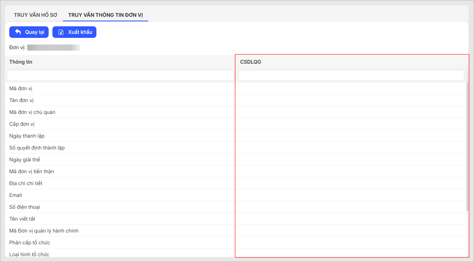 3. Phần mềm sẽ hiển thị thông tin đơn vị trên CSDLQG