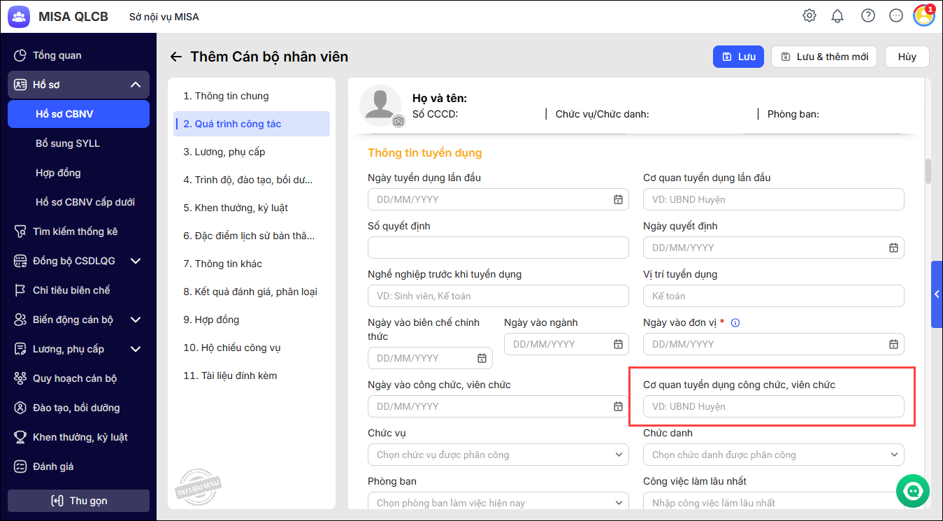 Phần mềm bổ sung thông tin cơ quan tuyển dụng công chức, viên chức khi khao báo hồ sơ CBNV để cán bộ tổ chức có thể theo dõi và quản lý theo quy định.
