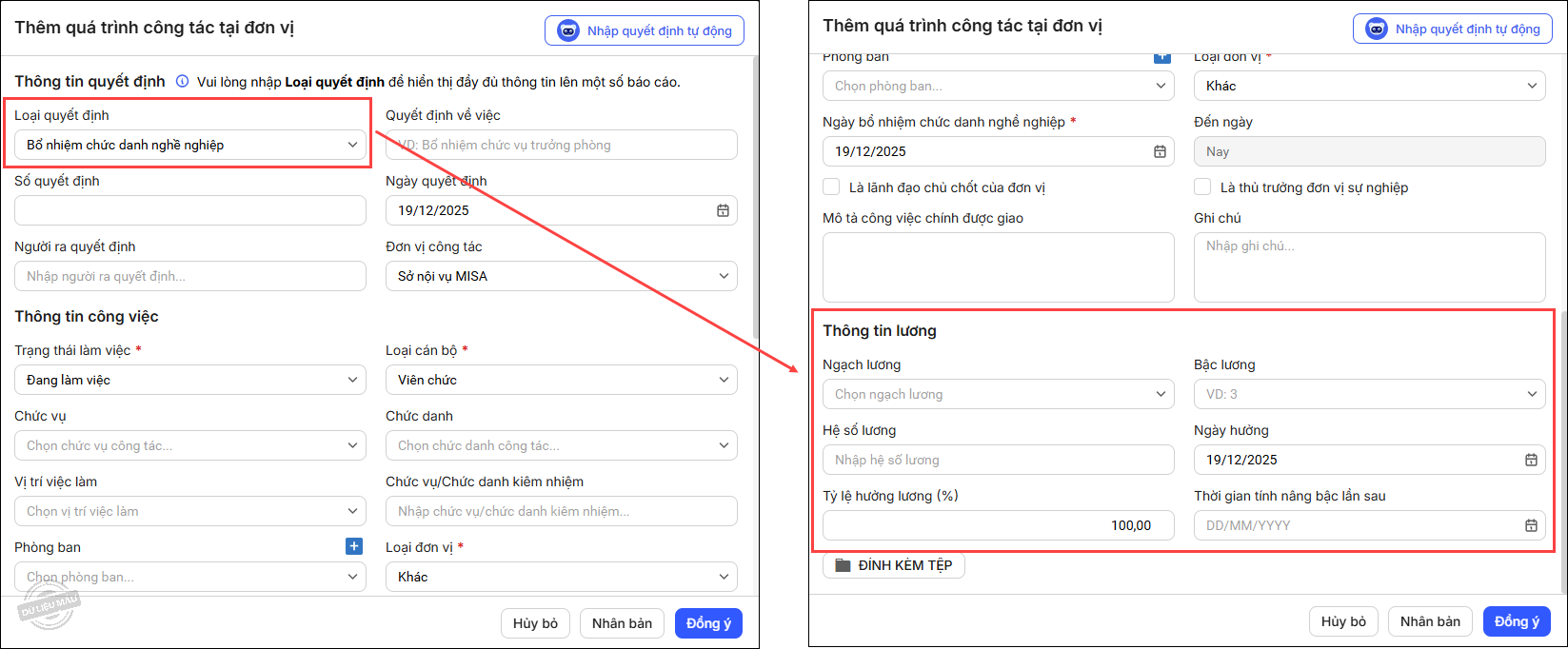 - Tại màn hình Hồ sơ\Hồ sơ CBNV, thêm hoặc sửa hồ sơ, tại mục Quá trình công tác, khi Thêm QTCT tại đơn vị và Thêm QTCT ngoài đơn vị, khi chọn Loại quyết định là Bổ nhiệm ngạch, Tuyển dụng và bổ nhiệm ngạch, Bổ nhiệm chức danh nghề nghiệp, Tuyển dụng và bổ nhiệm chức danh nghề nghiệp, anh/chị có thể khai Thông tin lương của CBNV.