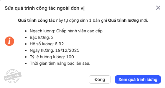 - Sau khi lưu quá trình công tác, phần mềm tự động sinh 1 bản ghi Lương tương ứng, anh/chị kiểm tra tại phần Quá trình lương.