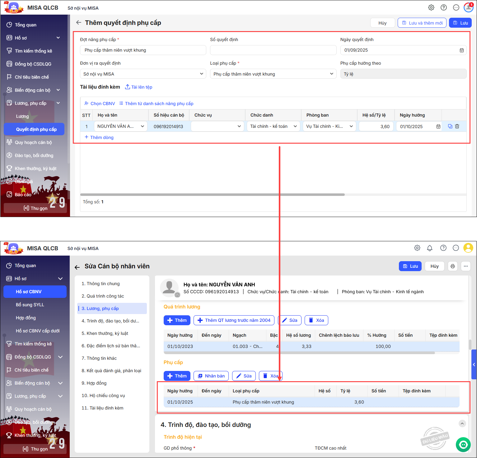 - Sau khi anh/chị thêm quyết định tại màn hình Lương, phụ cấp\Quyết định phụ cấp, phần mềm sẽ tự động sinh bản ghi phụ cấp mới tại màn hình Hồ sơ\Hồ sơ CBNV với các thông tin trên quyết định.