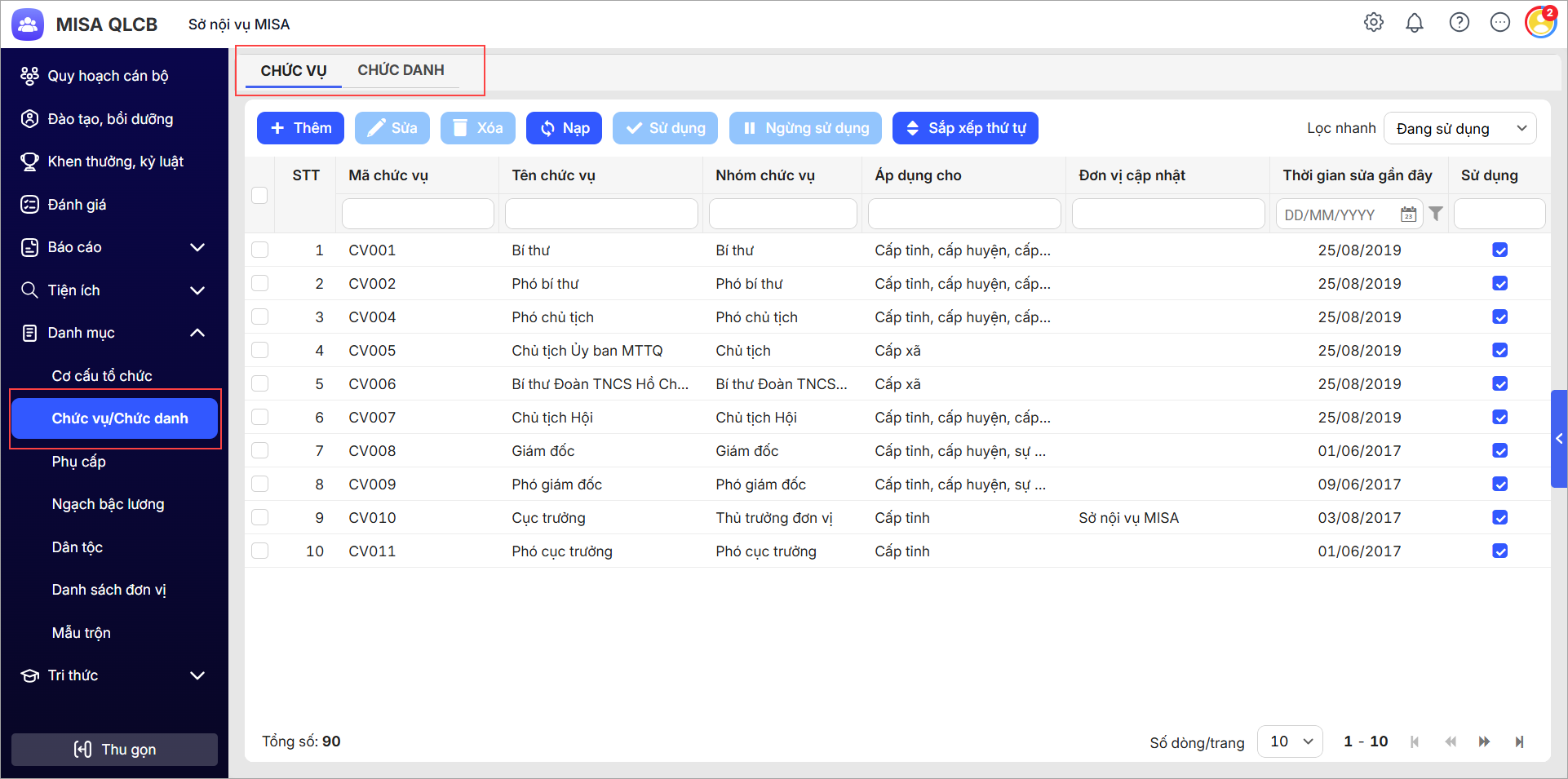 2. Chọn tab Chức vụ hoặc Chức danh để xem chi tiết. Có thể chọn lọc nhanh các chức vụ, chức danh đang sử dụng, ngừng sử dụng.