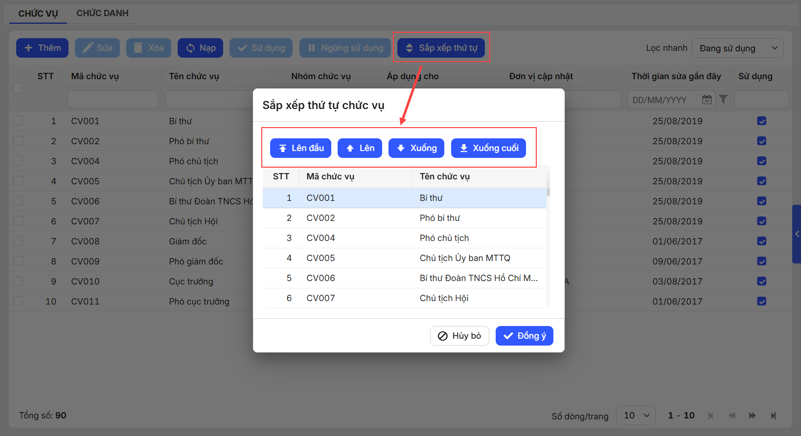 3. Nhấn Sắp xếp thứ tự. Anh/chị có thể sắp xếp các chức vụ chức danh lên hoặc xuống; lên đầu hoặc xuống cuối.