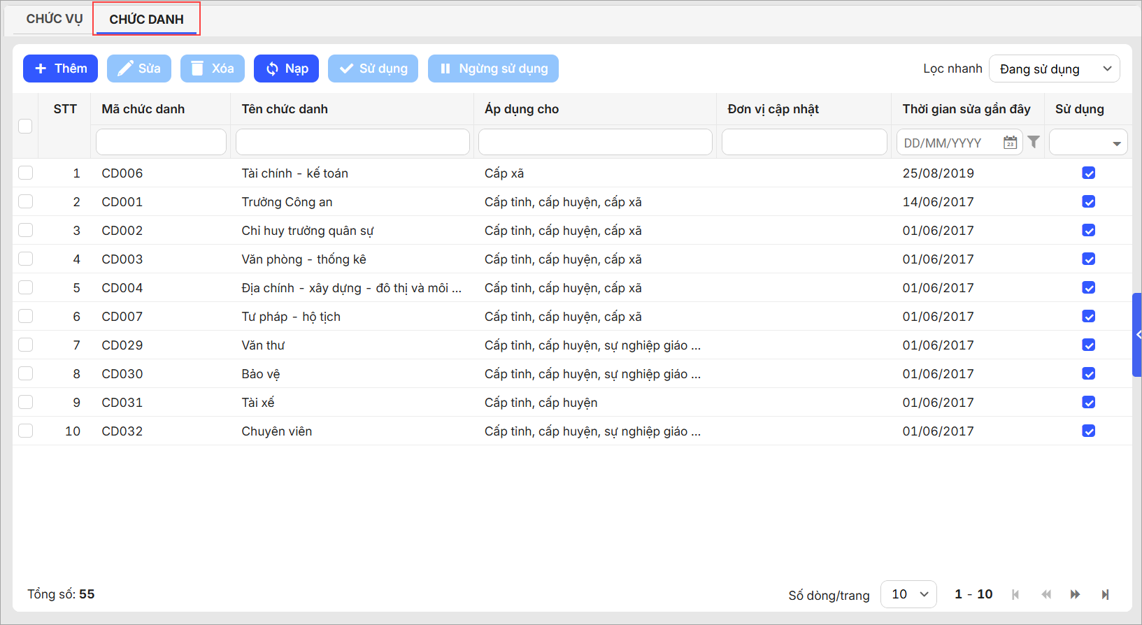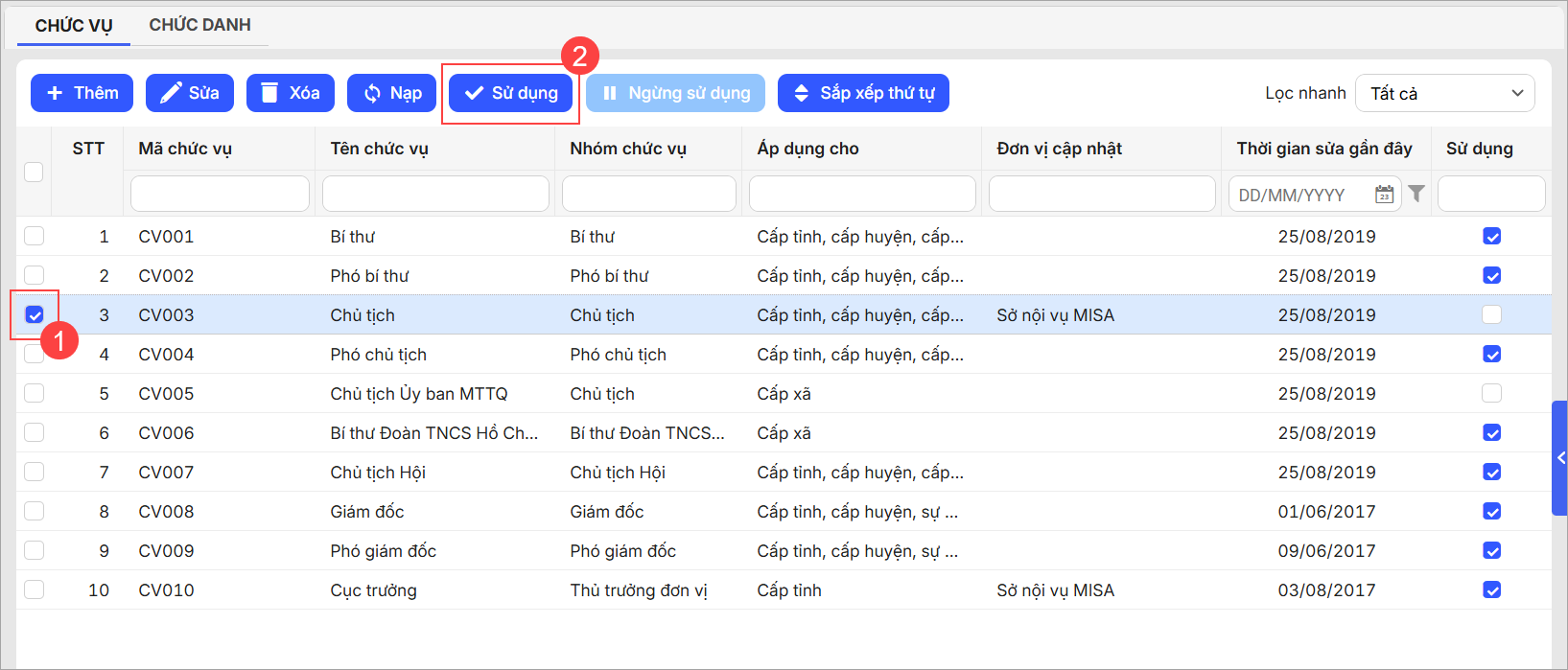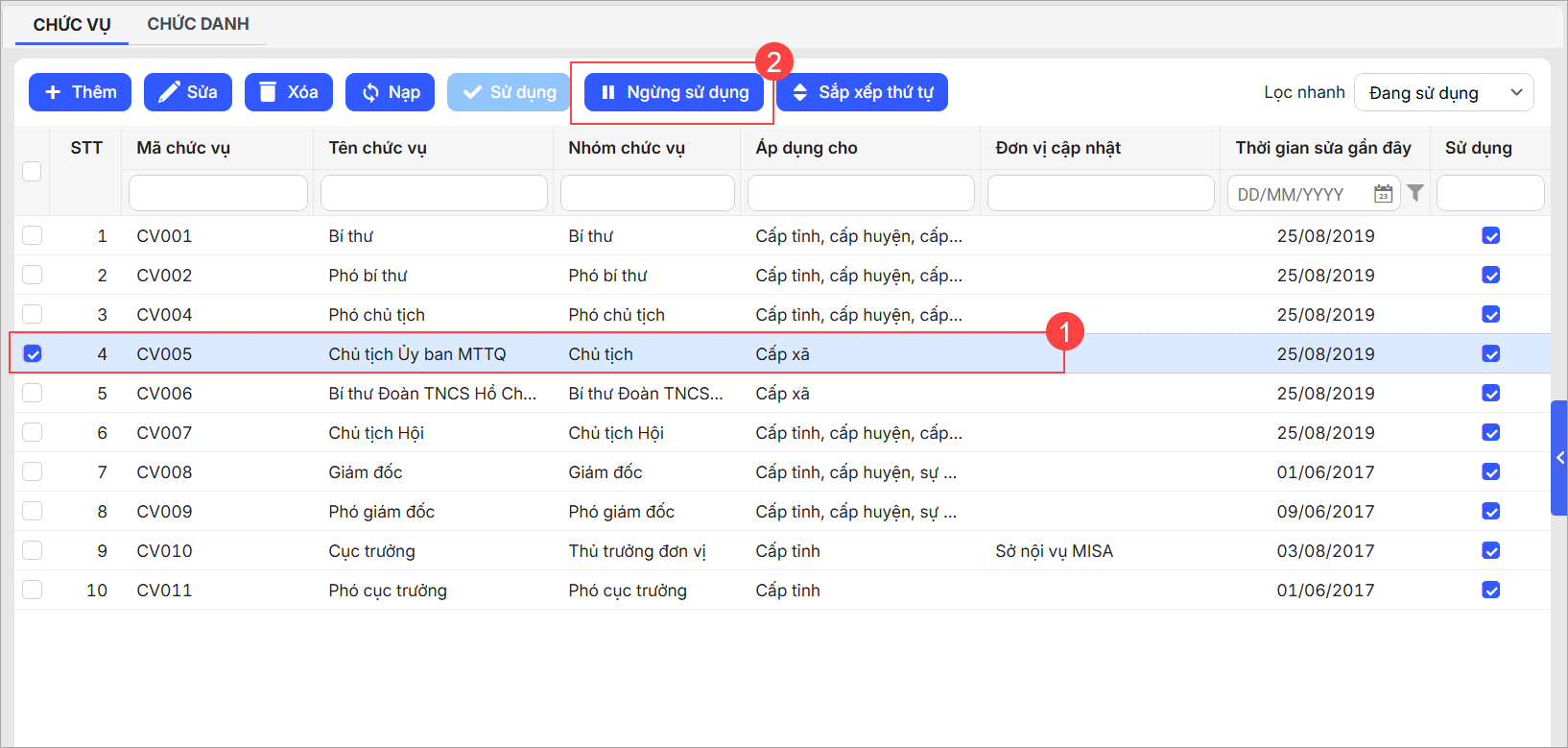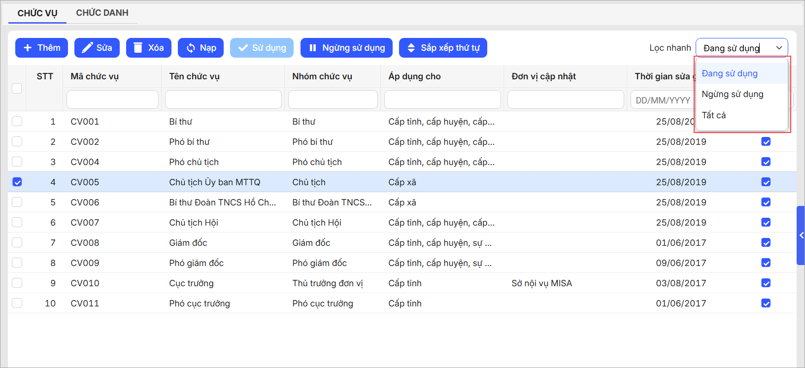 5. Anh/chị có thể lọc nhanh chức vụ/chức danh có trạng thái đang sử dụng/ngừng sử dụng hoặc xem theo tất cả.