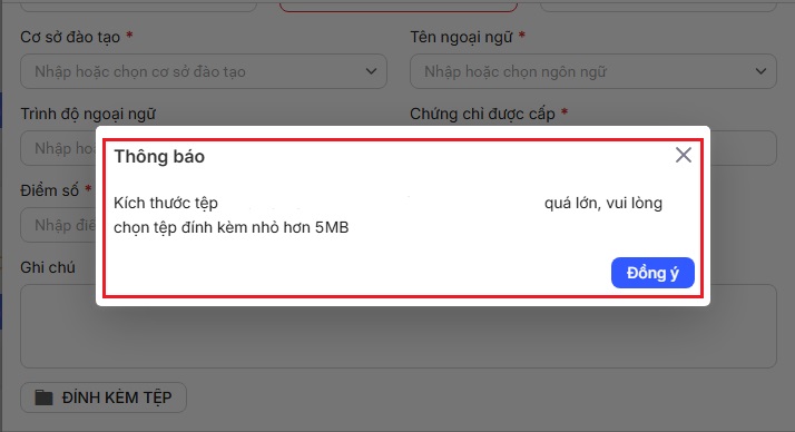 Khi scan tài liệu nhưng không đính kèm được do file quá dung lượng, nguyên nhân là phần mềm chỉ cho phép tải lên tệp có kích thước ≤ 5Mb tại các chức năng đính kèm (mục 11, quá trình công tác, lương, phụ cấp…).