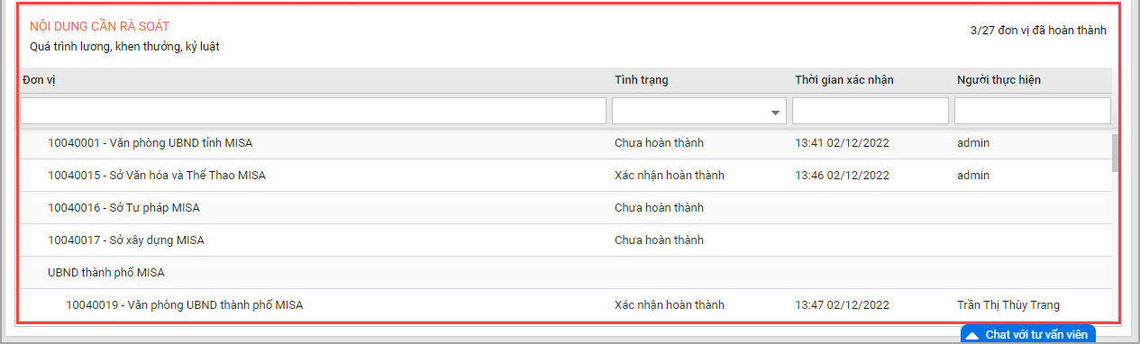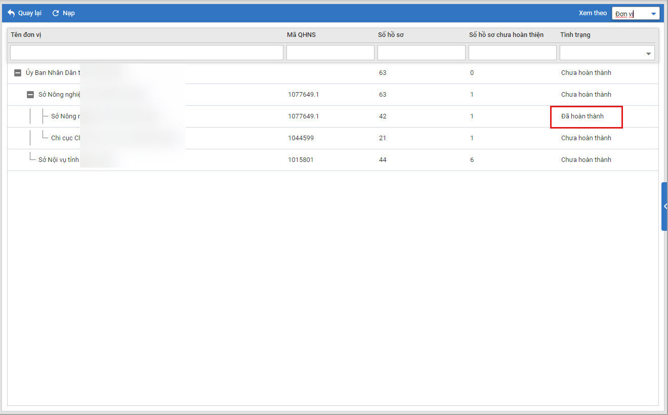 - Thông tin chi tiết đơn vị nào Chưa hoàn thành; đơn vị nào đã Xác nhận hoàn thành.