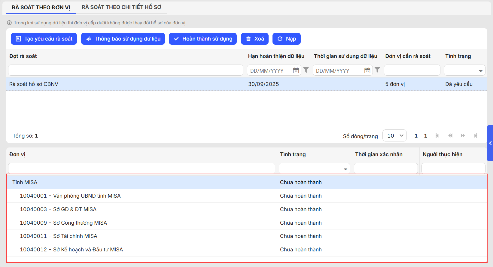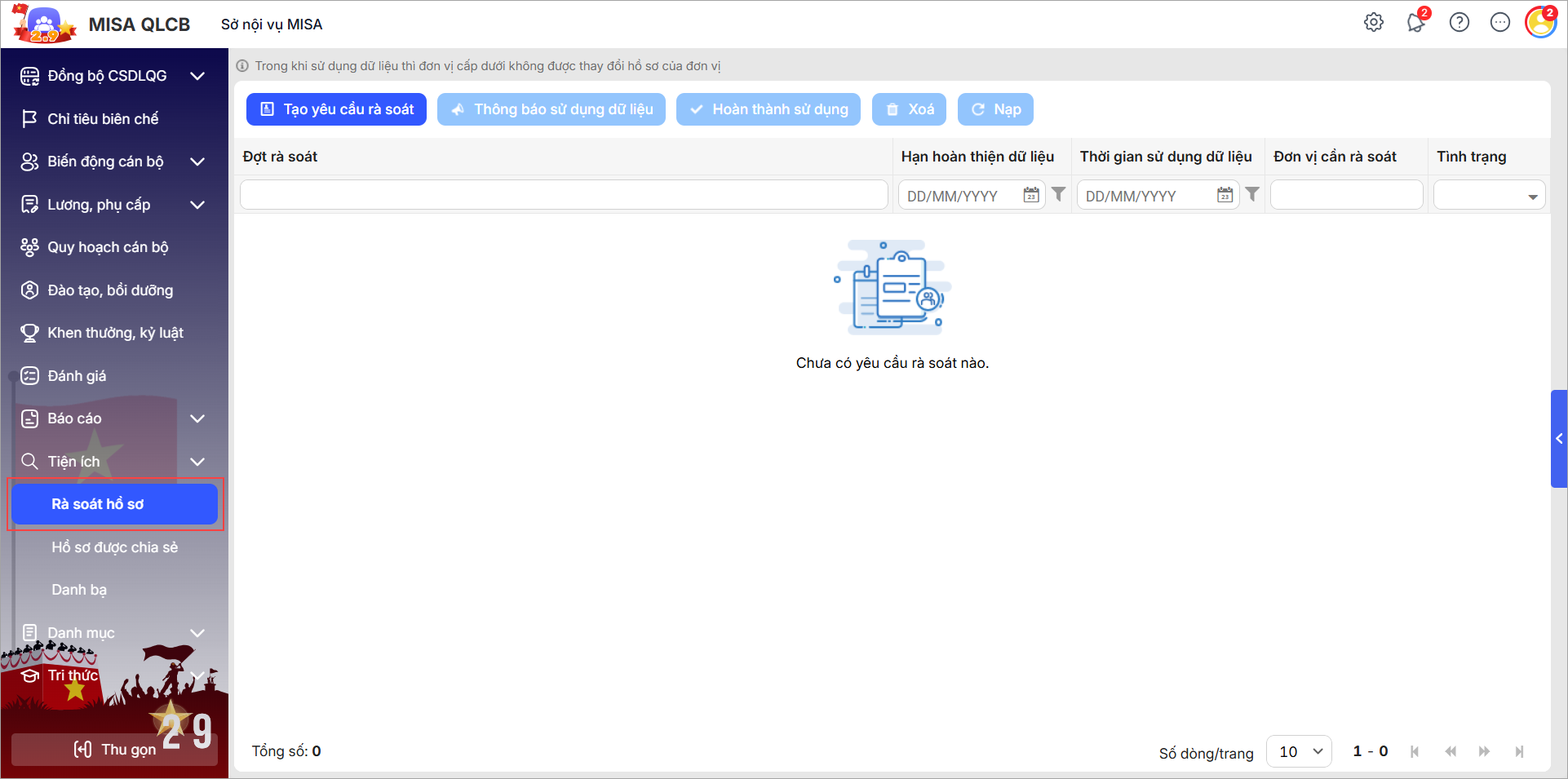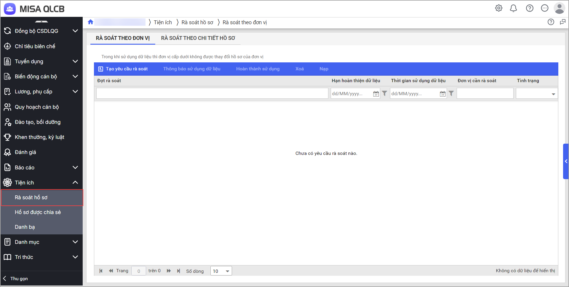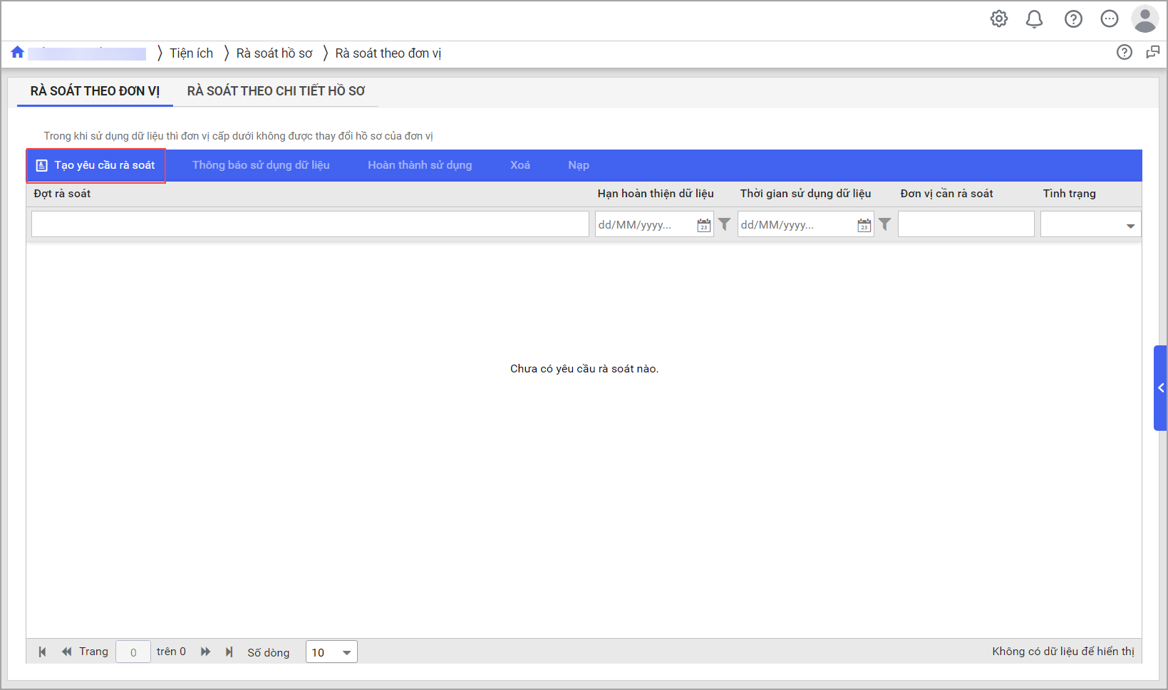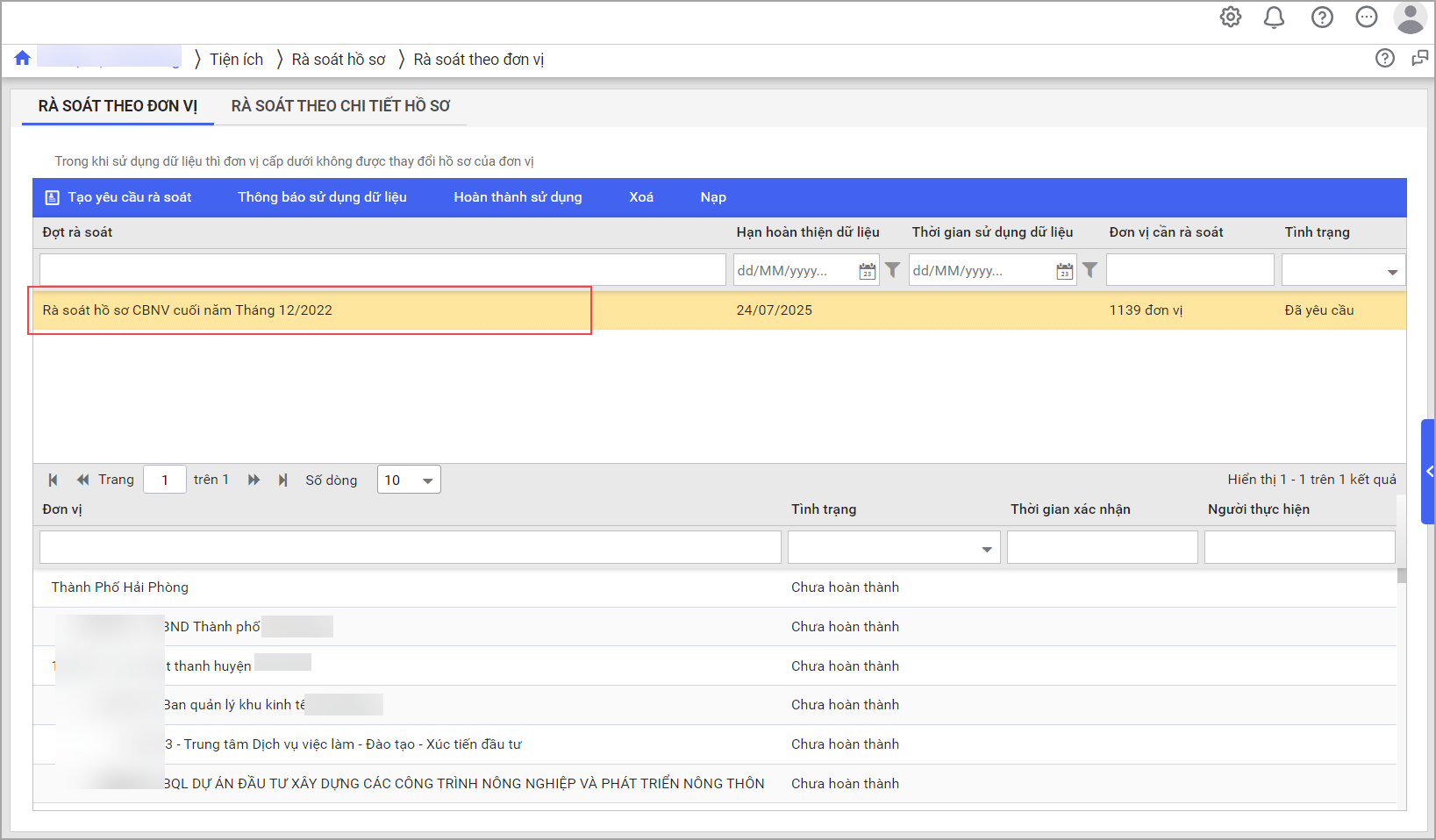 Để theo dõi tình trạng hoàn thành hồ sơ của các đơn vị, vào Rà soát hồ sơ. Tại đây, anh/chị có thể theo dõi danh sách yêu cầu rà soát hồ sơ đã tạo.