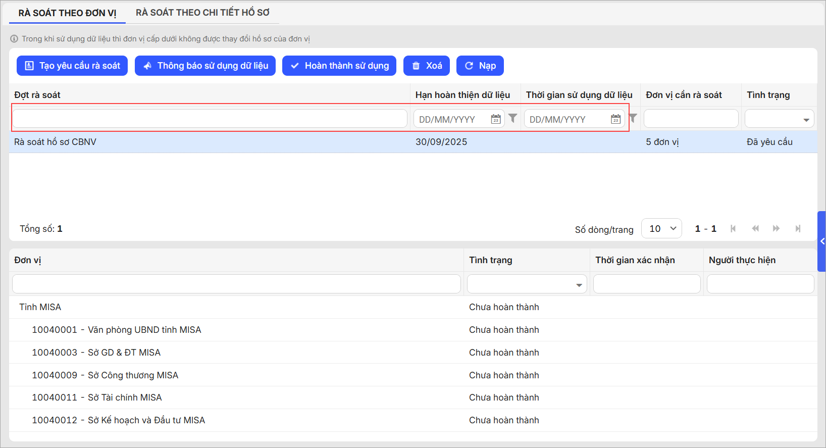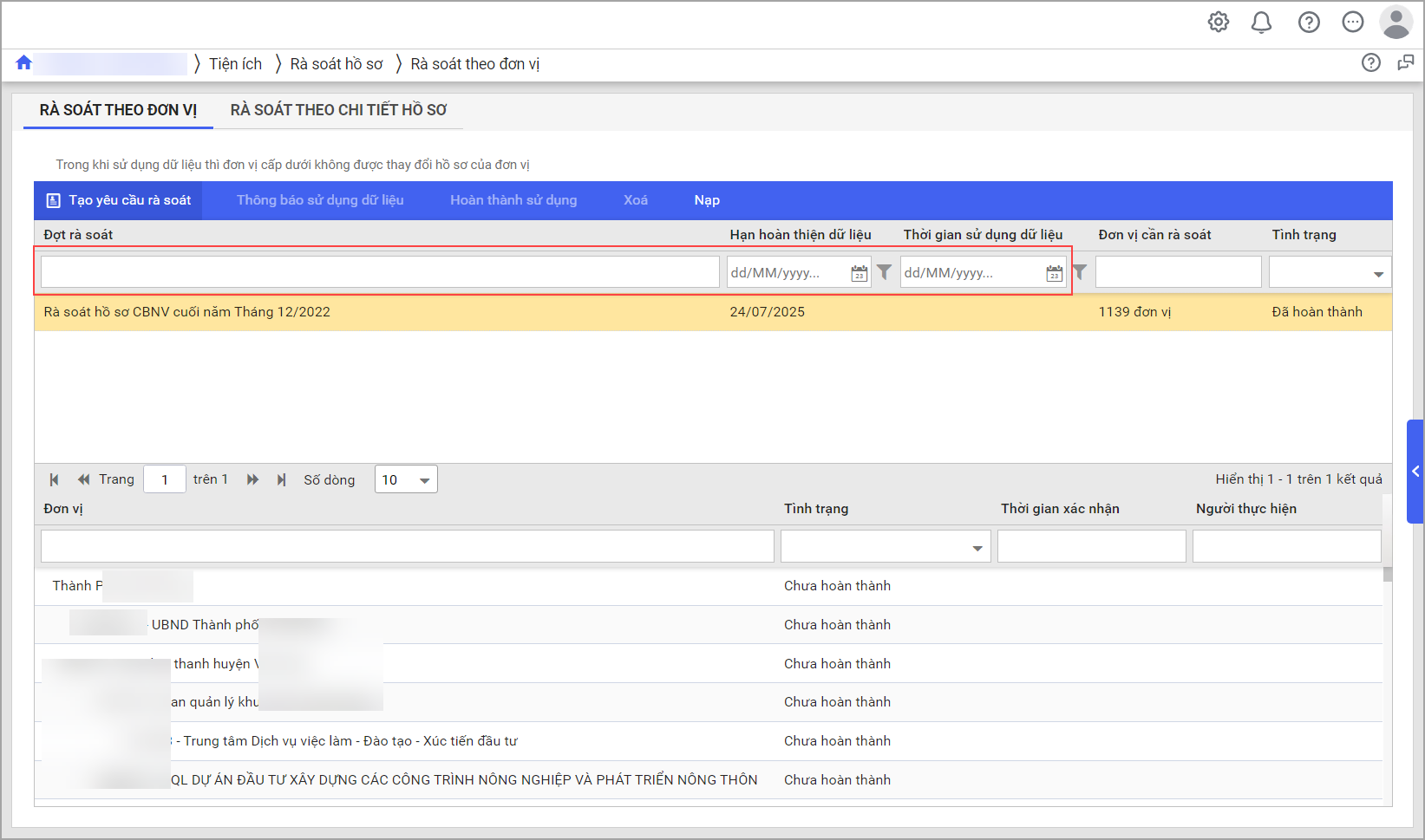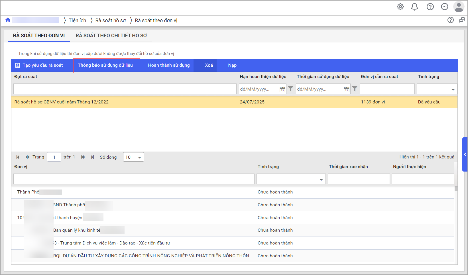 - Hạn hoàn thiện dữ liệu: Thời hạn đơn vị được yêu cầu rà soát cần hoàn thành việc hoàn thiện dữ liệu.