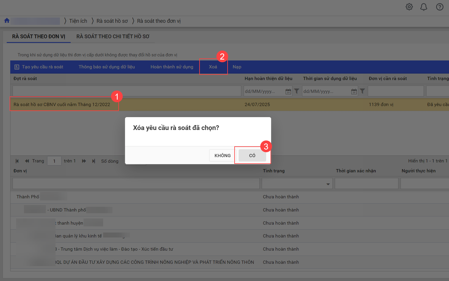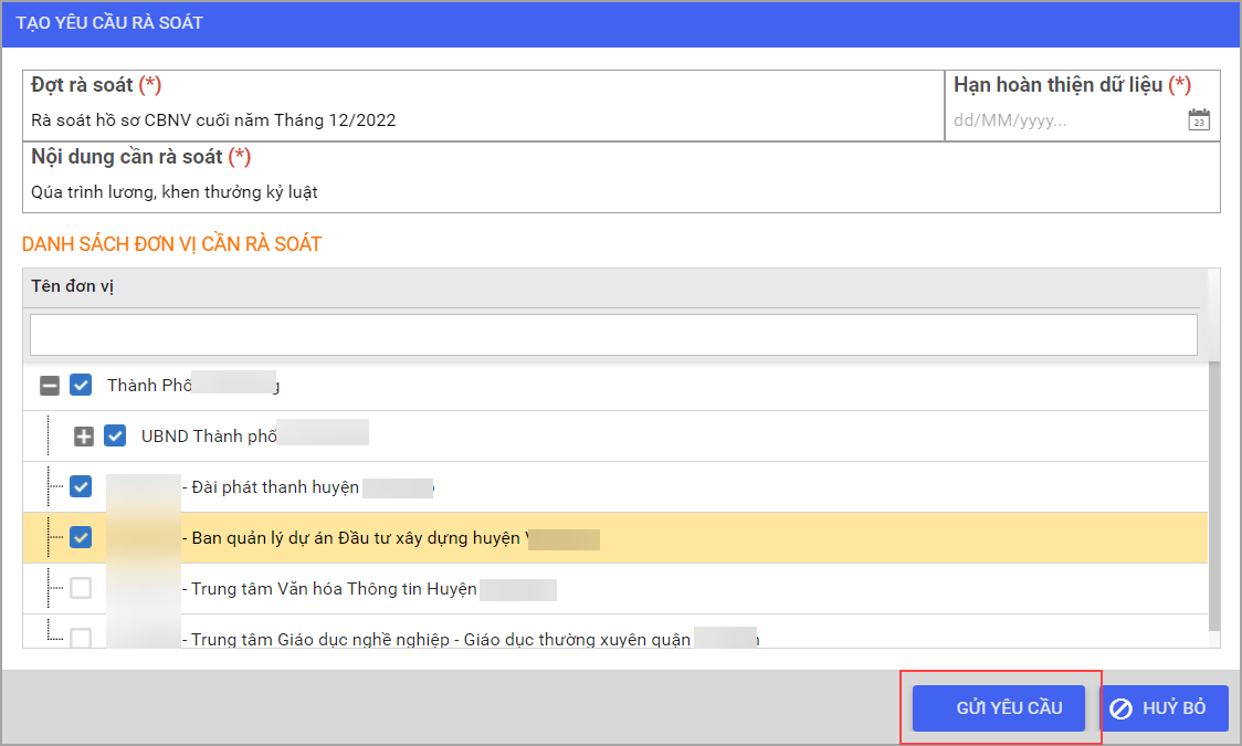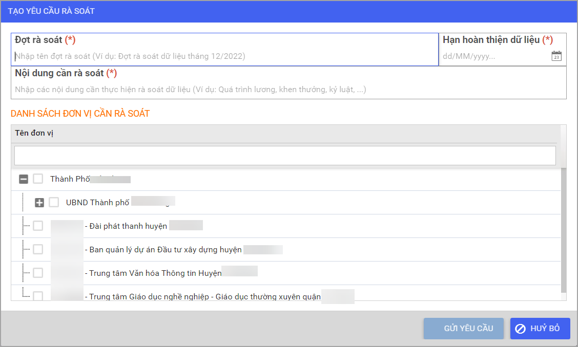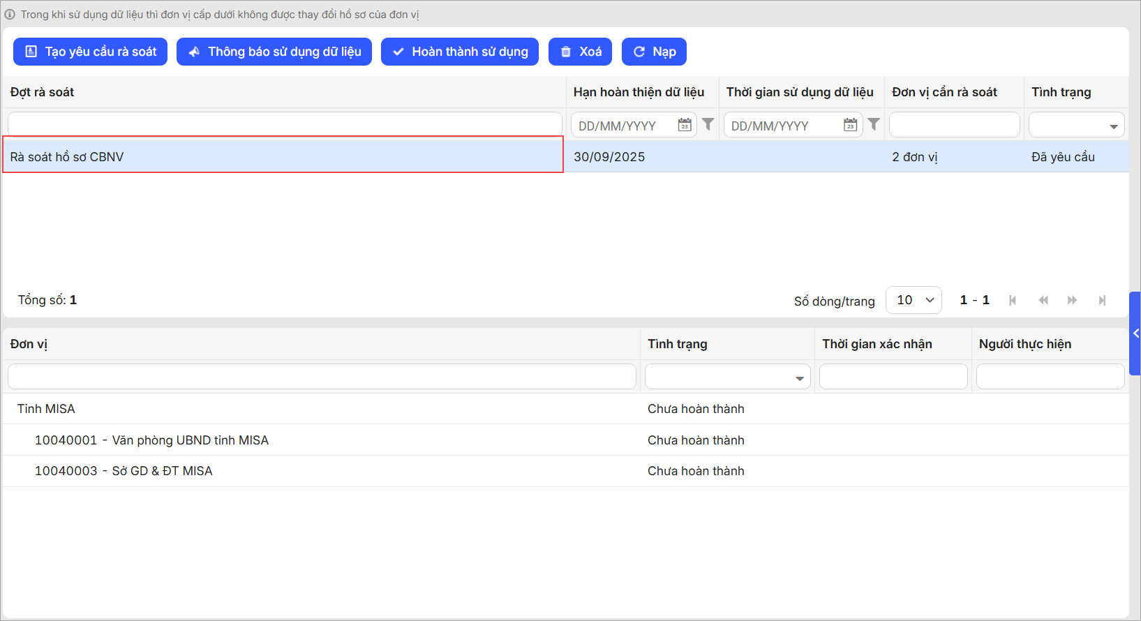- Hạn hoàn thiện dữ liệu: Thời hạn đơn vị được yêu cầu rà soát cần hoàn thành việc hoàn thiện dữ liệu.