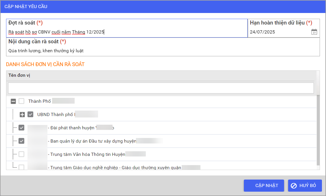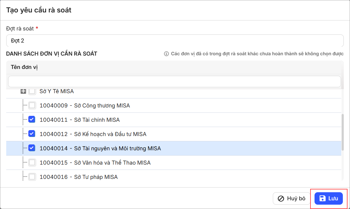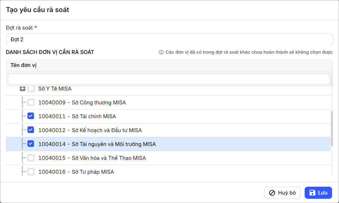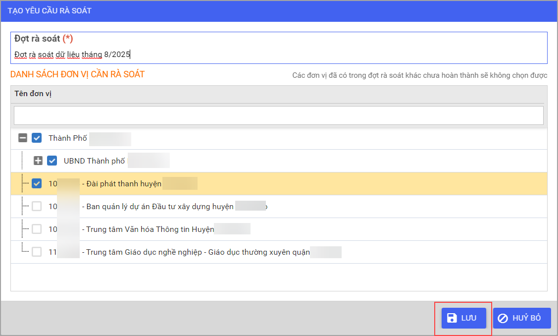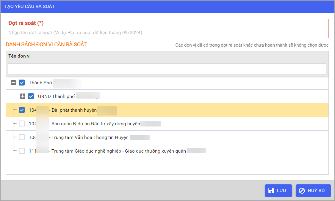 - Tích chọn các đơn vị cần rà soát trong Danh sách đơn vị.
