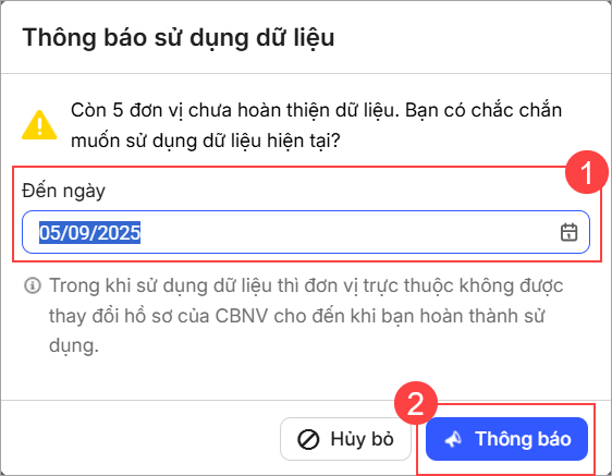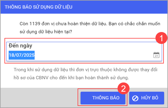 - Nhập ngày sẽ sử dụng dữ liệu để các đơn vị trực thuộc không thay đổi thông tin trên hồ sơ CBNV trong khoảng thời gian từ ngày gửi thông báo đến ngày này.