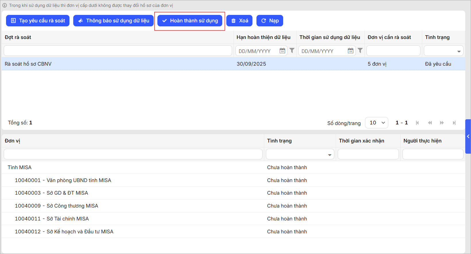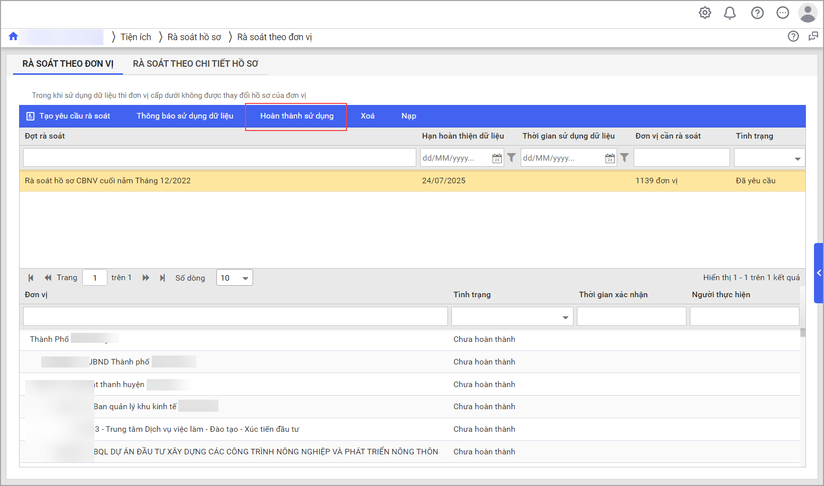 - Để hoàn tất đợt rà soát khi các đơn vị trực thuộc đã bổ sung xong hồ sơ, anh/chị chọn Hoàn thành rà soát