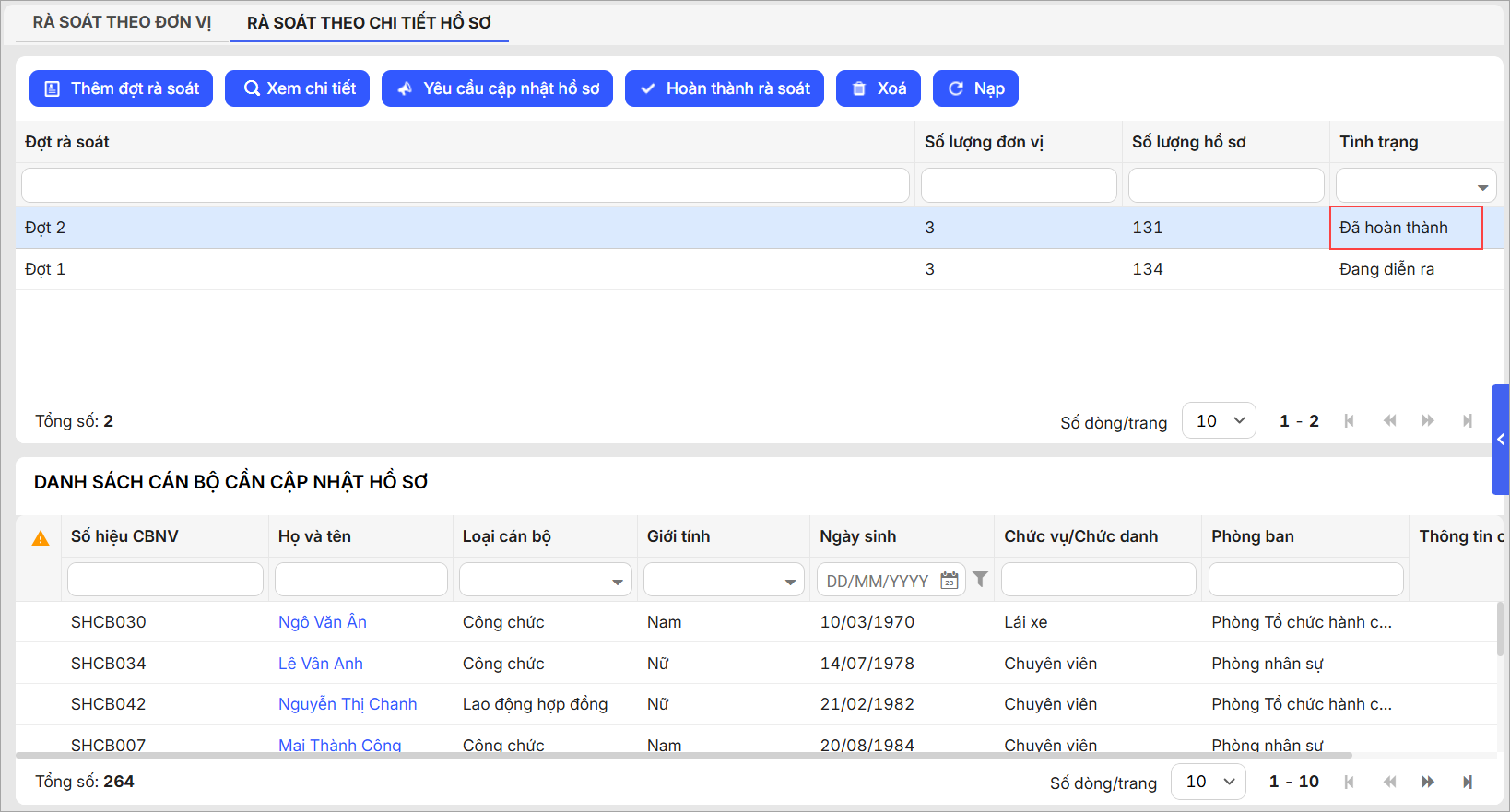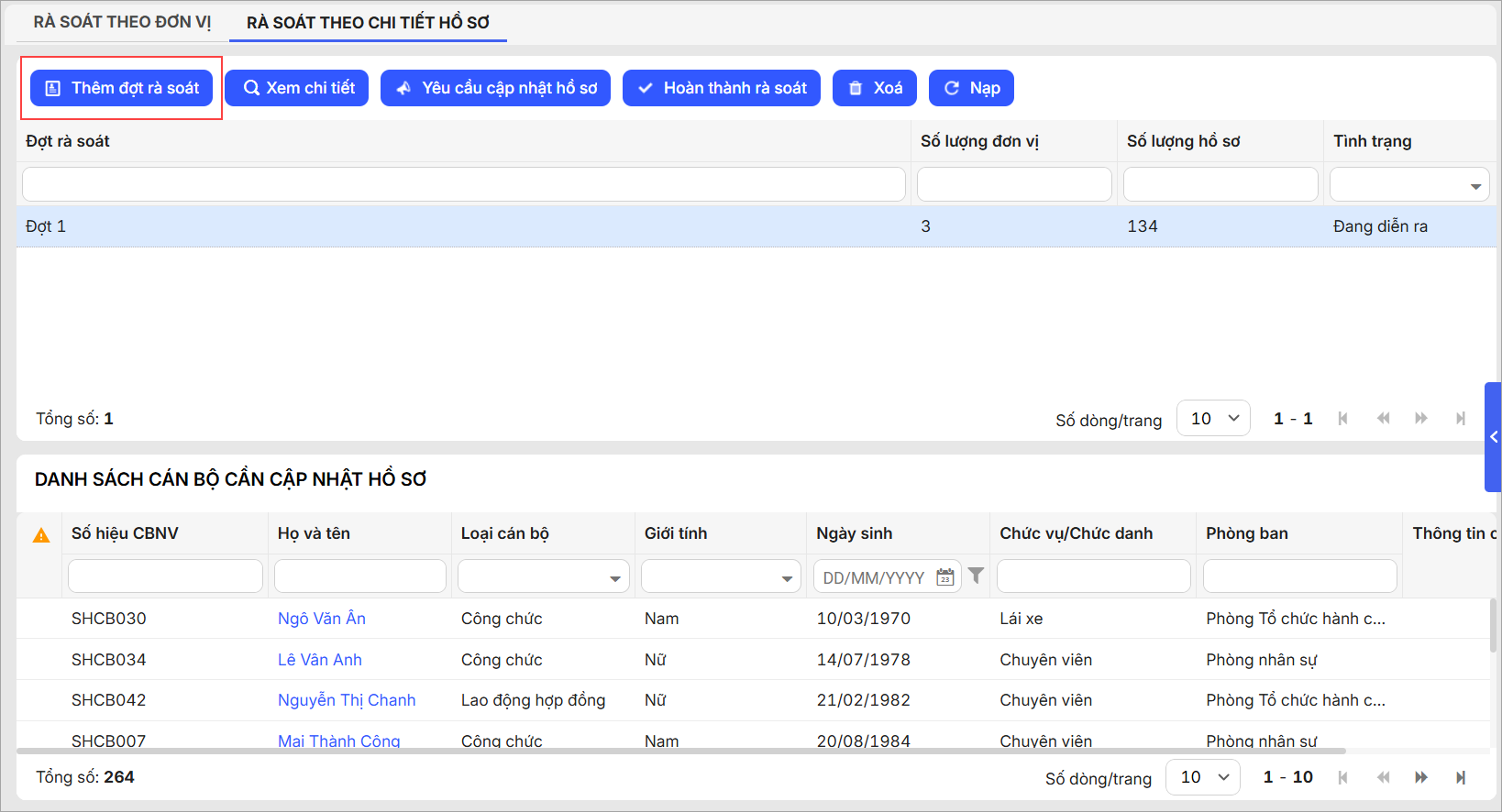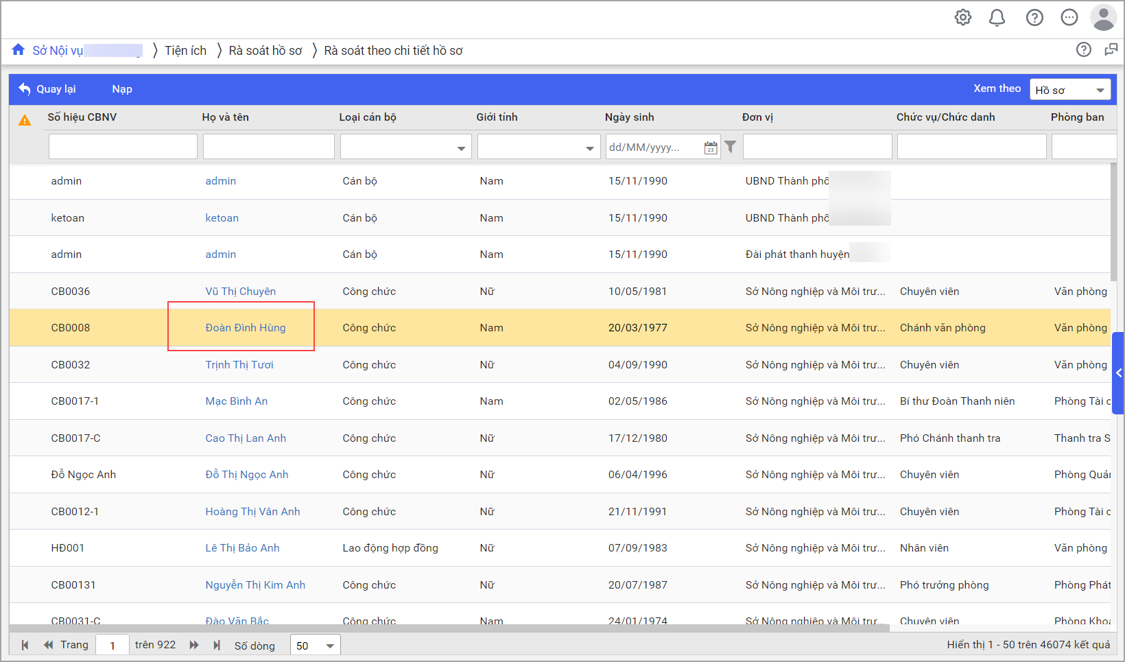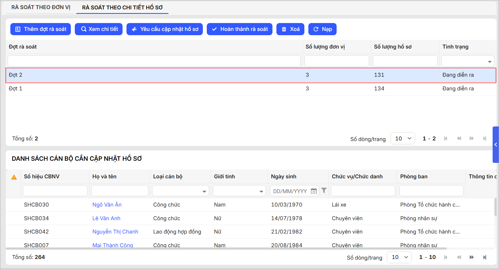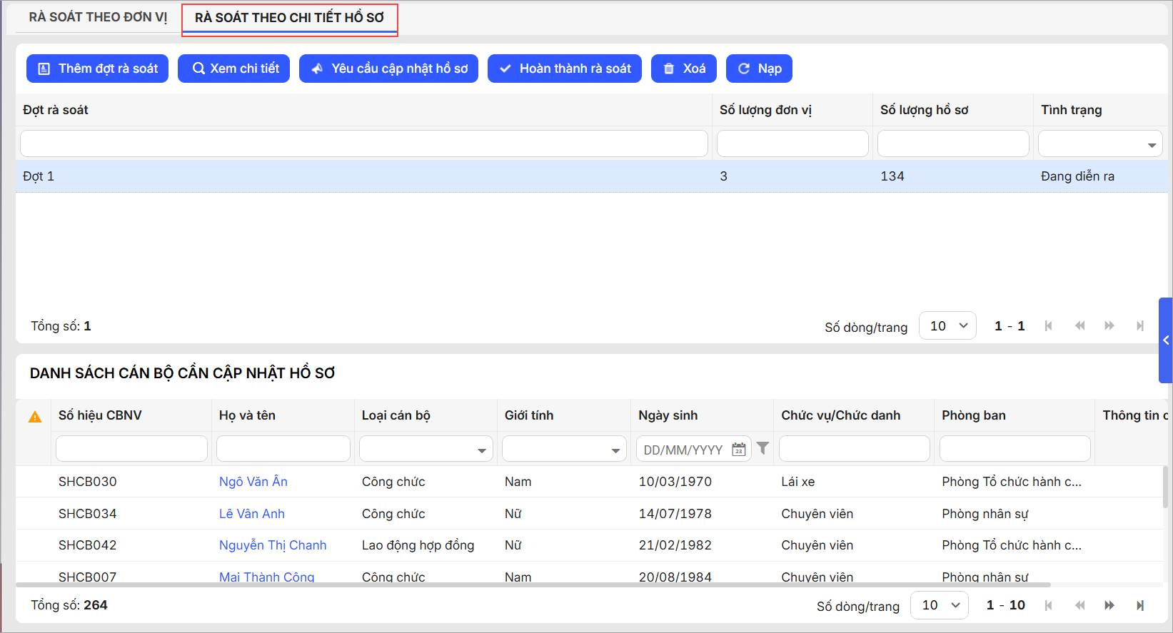 - Sau khi chọn vào đợt rà soát để xem chi tiết, phần mềm sẽ hiển thị danh sách tất cả hồ sơ CBNV của tác đơn vị có trong đợt rà soát