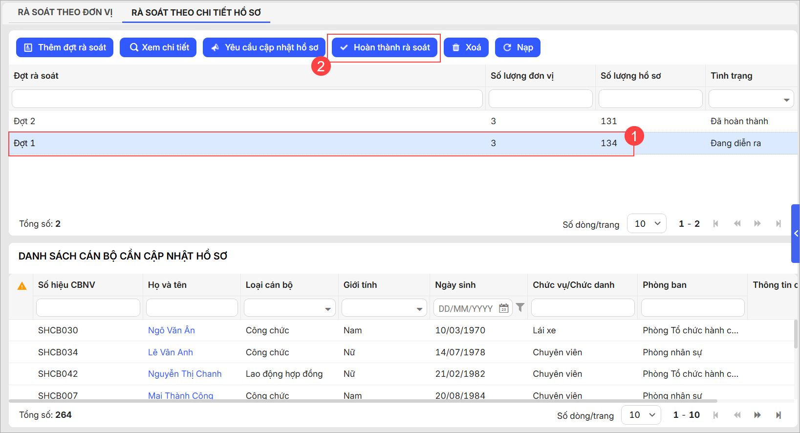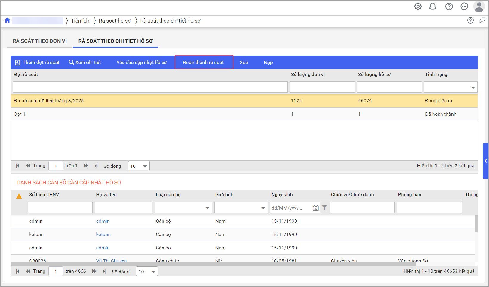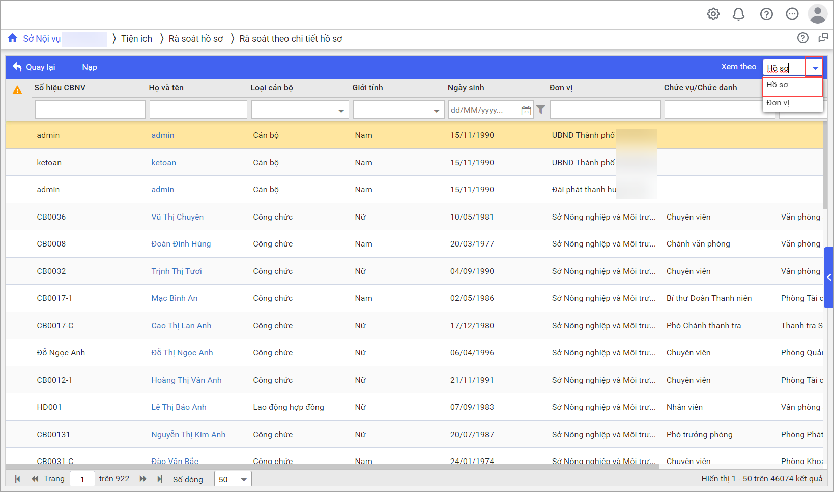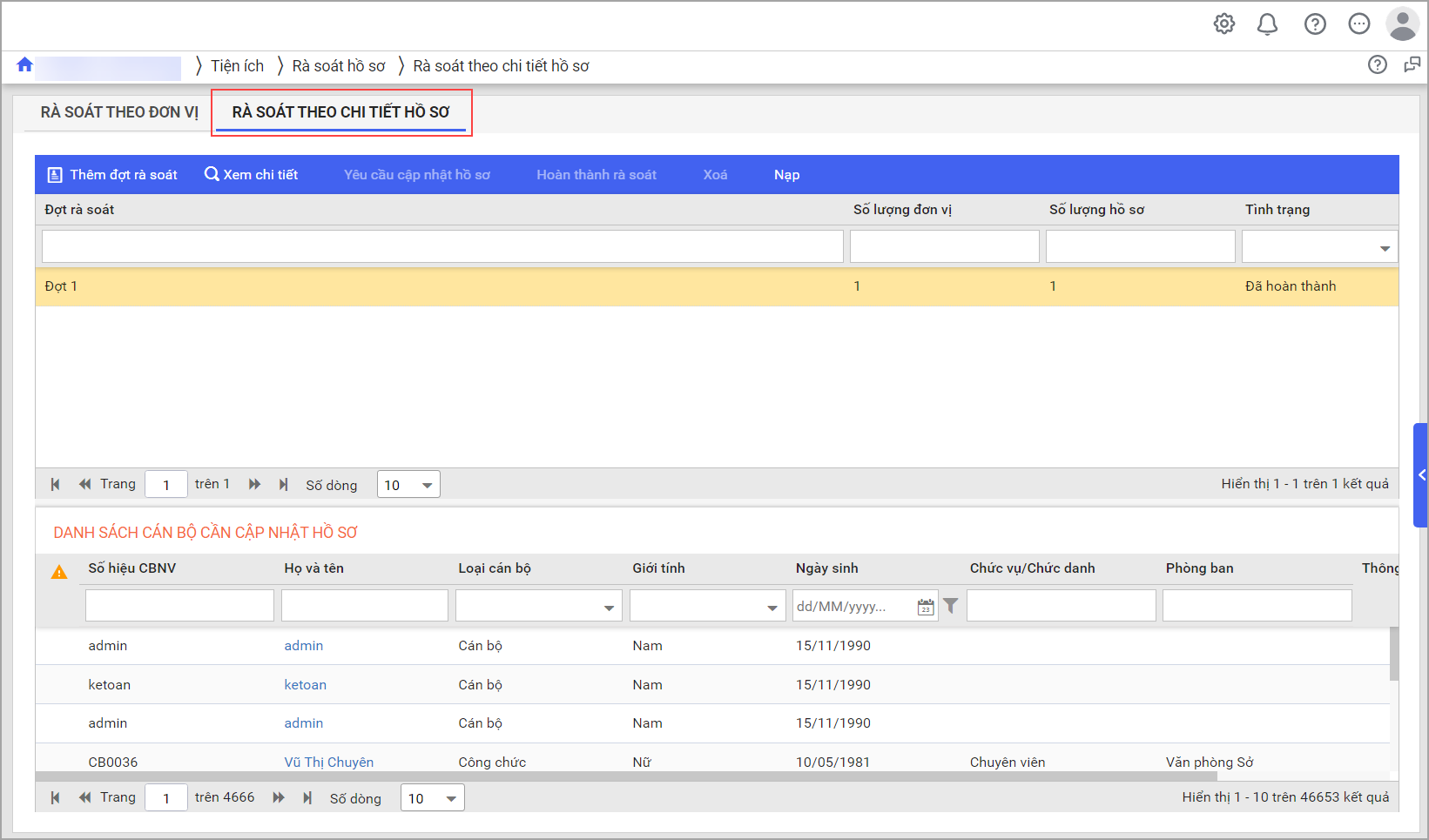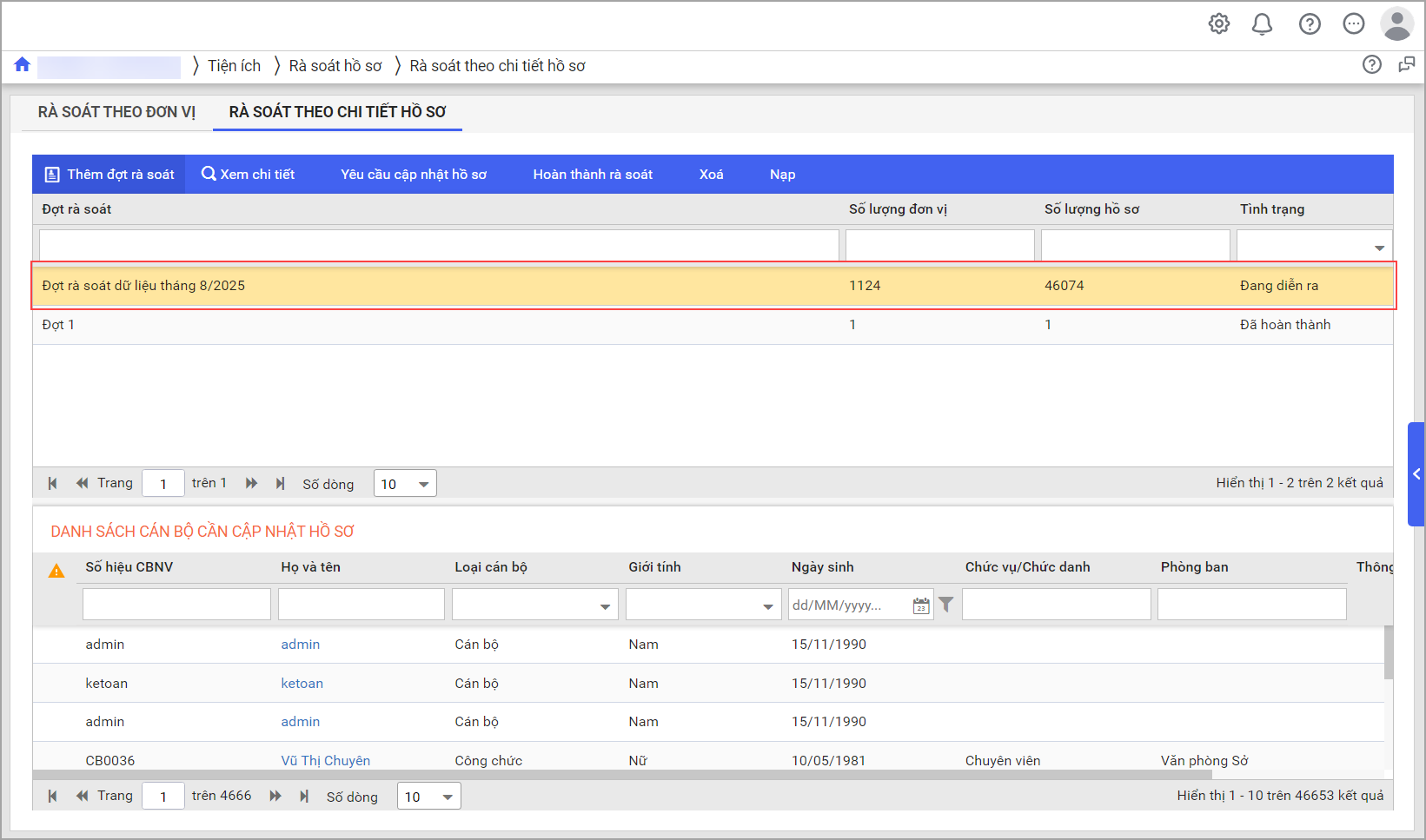 - Sau khi chọn vào đợt rà soát để xem chi tiết, phần mềm sẽ hiển thị danh sách tất cả hồ sơ CBNV của tác đơn vị có trong đợt rà soát