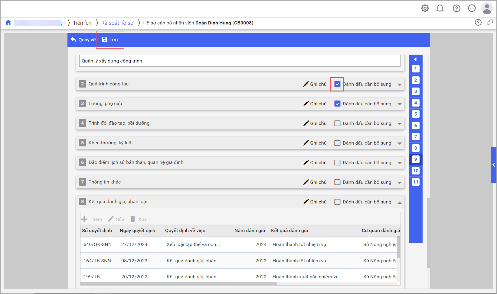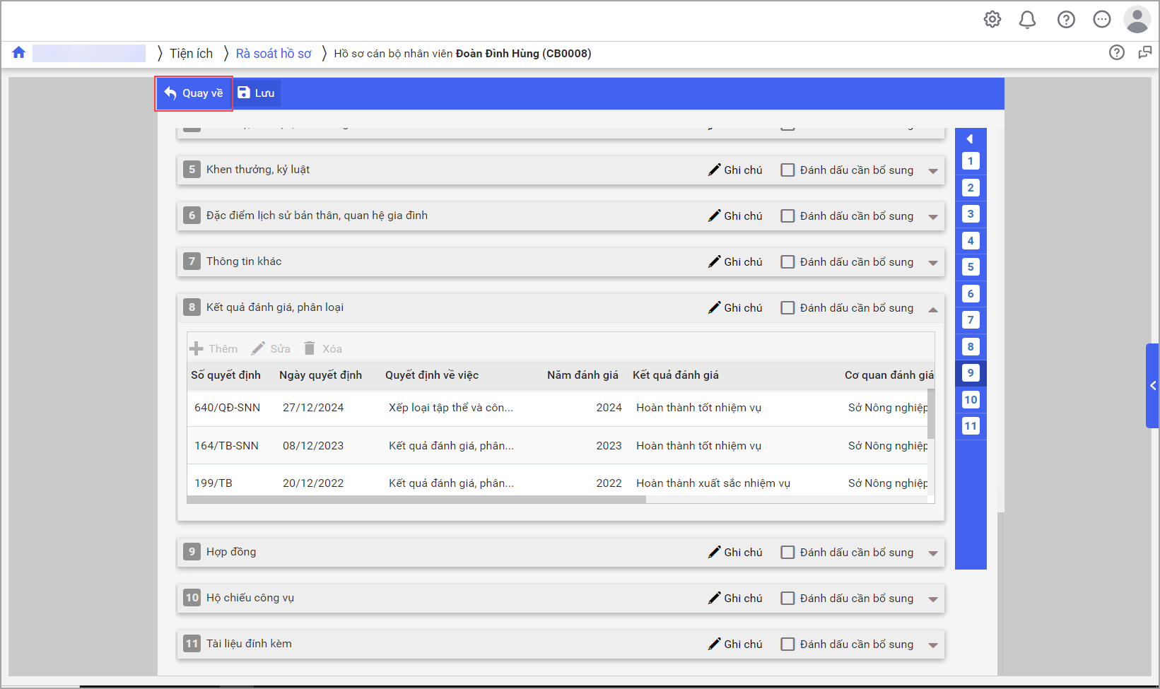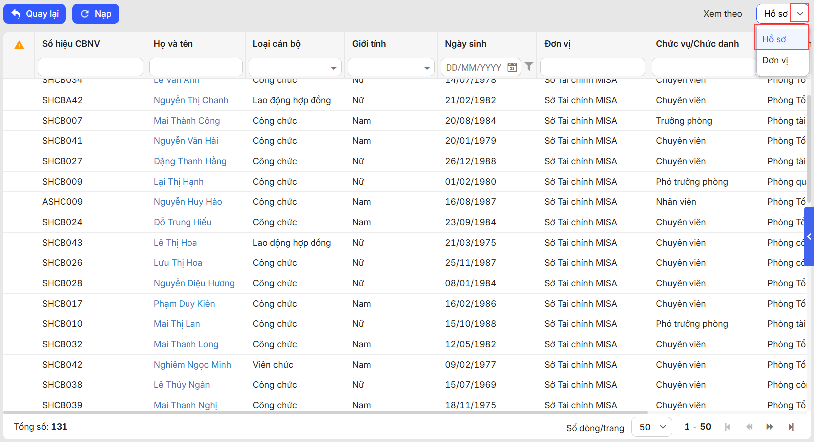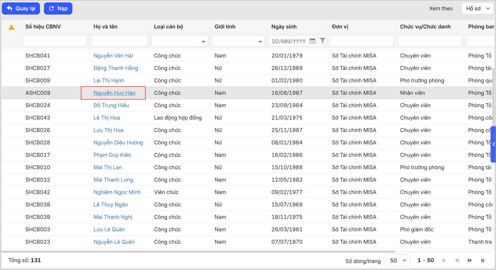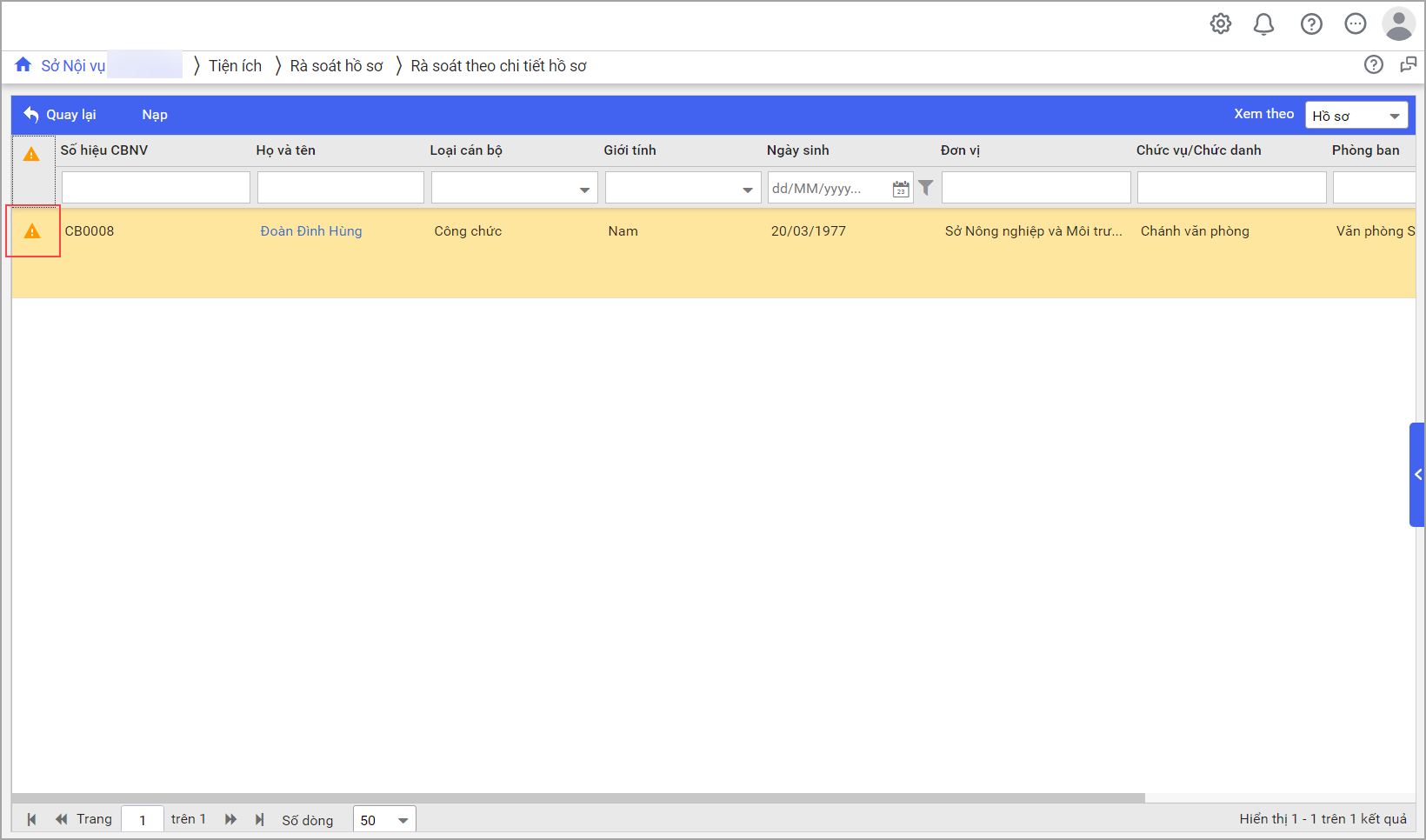 - Sau khi chọn vào đợt rà soát để xem chi tiết, phần mềm sẽ hiển thị danh sách tất cả hồ sơ CBNV của tác đơn vị có trong đợt rà soát