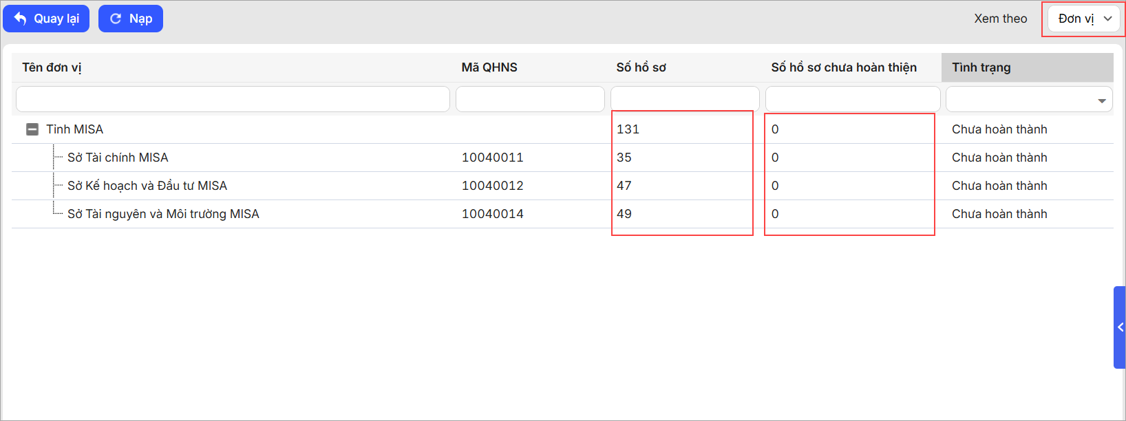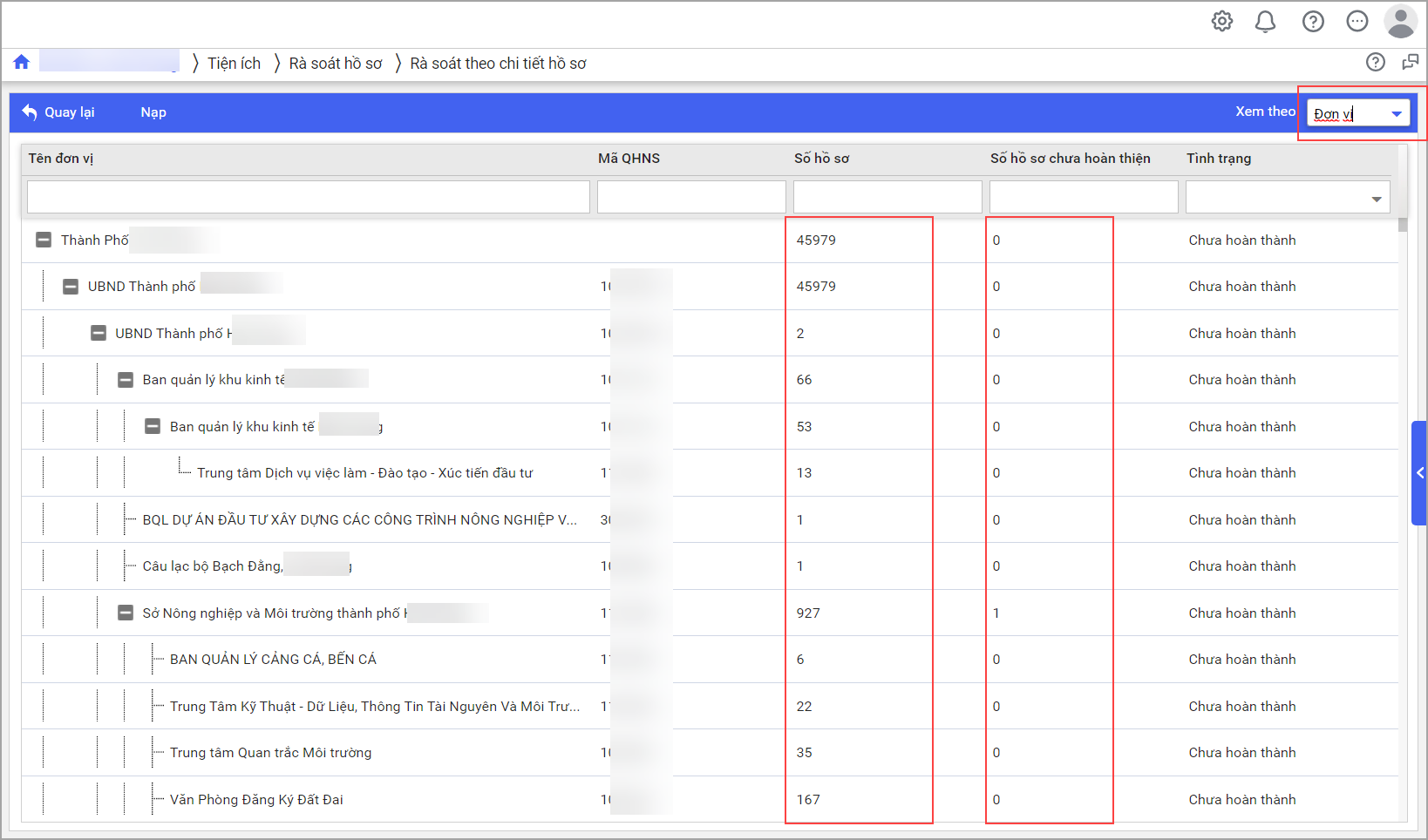 - Để xem thông tin chi tiết đợt rà soát bao gồm: Tổng số lượng hồ sơ đơn vị cấp dưới và tổng số lượng hồ sơ có thông tin sai/thiếu của từng đơn vị cụ thể, anh/chị chọn Xem theo đơn vị