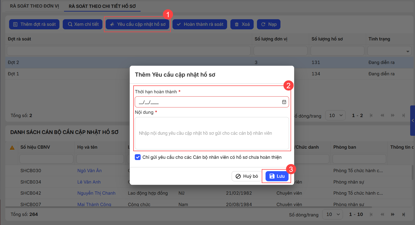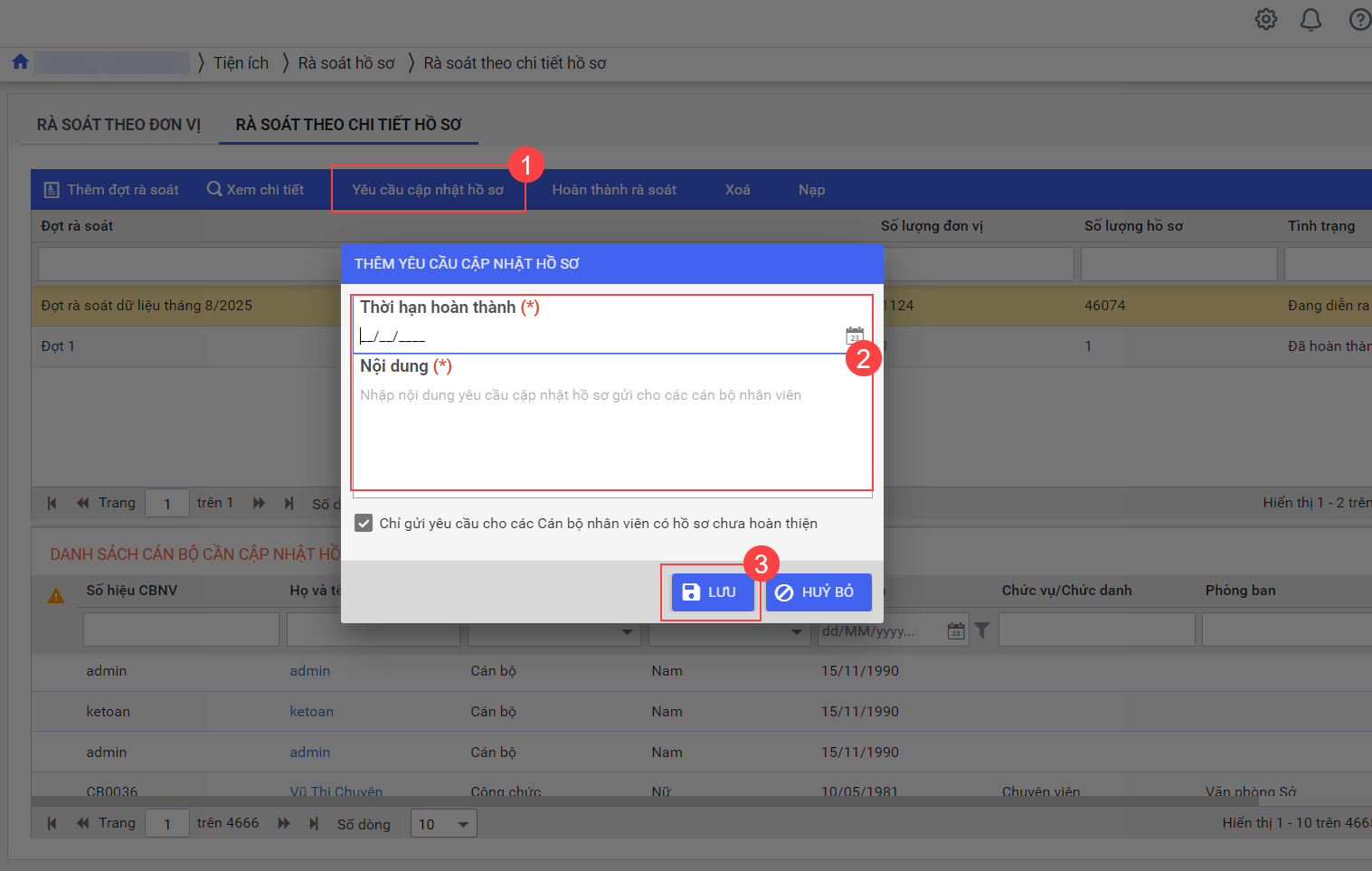 - Sau khi kiểm tra thông tin tất cả CBNV có hồ sơ chưa hoàn thiện, chọn Yêu cầu cập nhật hồ sơ để yêu cầu đơn vị cấp dưới và CBNV kiểm tra và cập nhật hồ sơ của mình