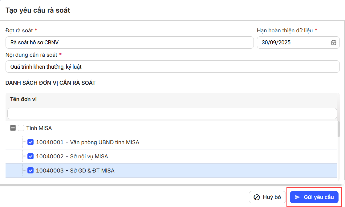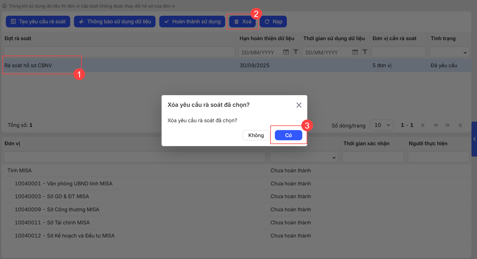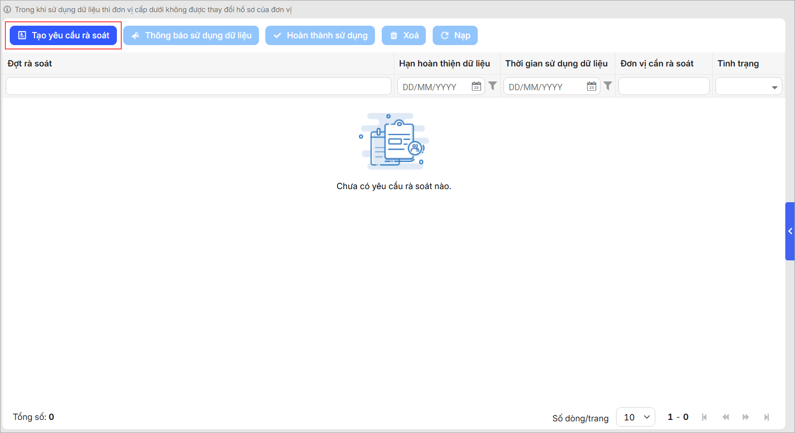- Khi CBTC đơn vị chủ quản muốn thông báo cho đơn vị trực thuộc về đợt rà soát thống kê số liệu, chọn Tạo yêu cầu rà soát.
