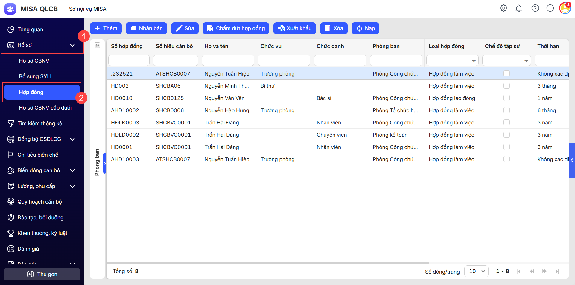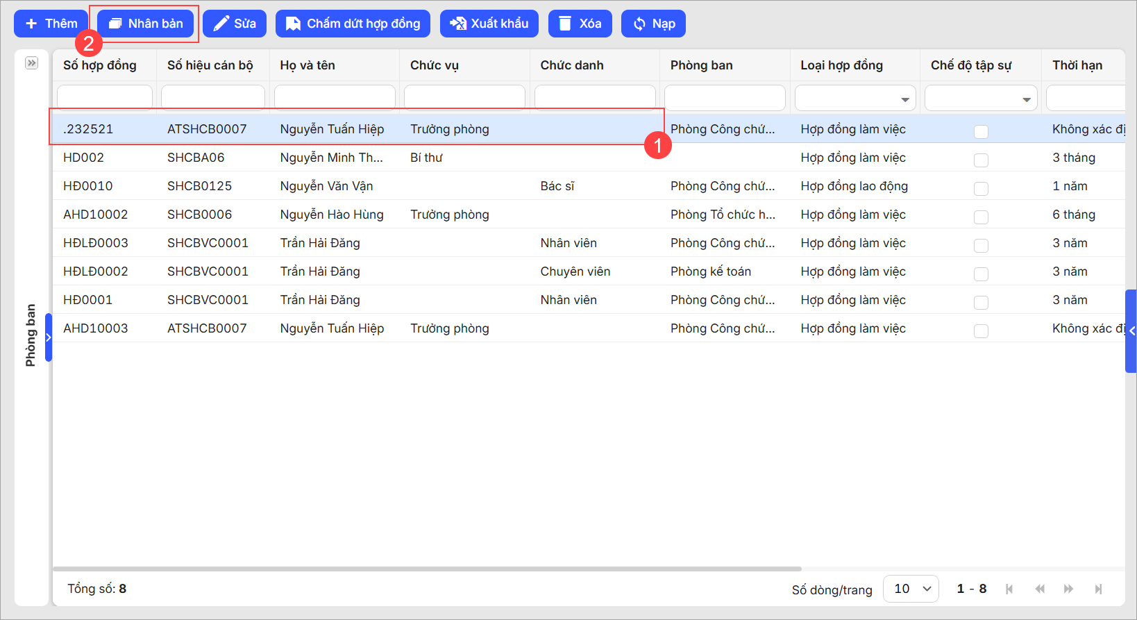 - Chọn hợp đồng của CBCCVC trên danh sách, nhấn Nhân bản hợp đồng.