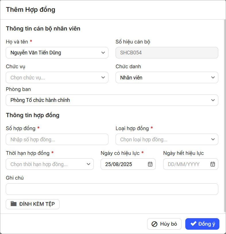 - Tại phần Thông tin hợp đồng: nhập Số hợp đồng, Loại hợp đồng, Thời hạn hợp đồng, Ngày có hiệu lực, Ngày hết hiệu lực, Ghi chú (nếu có).