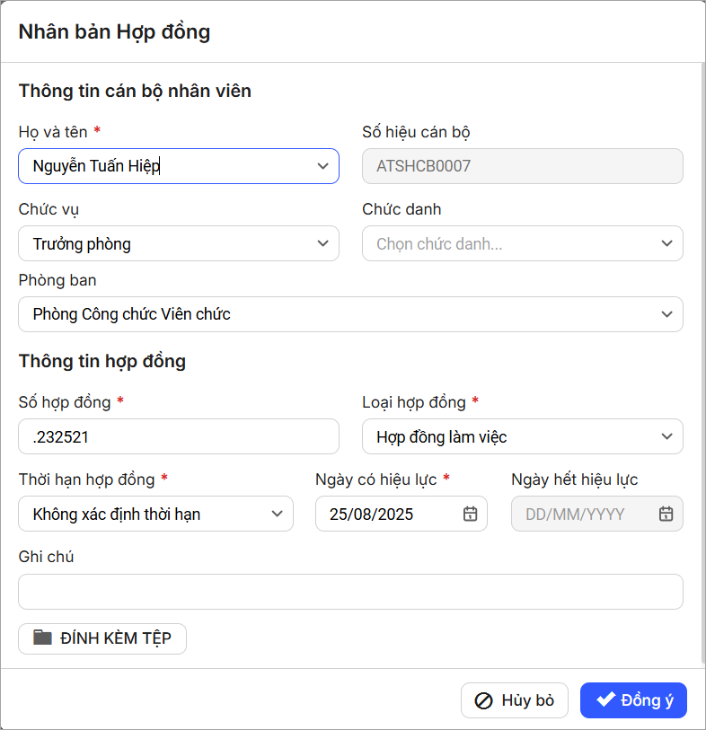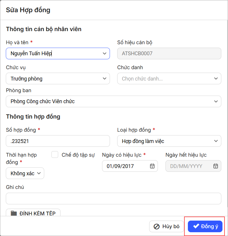 - Nhâp lại Ngày chấm dứt hợp đồng và nhấn Đồng ý để xác nhận muốn chấm dứt hợp đồng với CBCCVC này.
