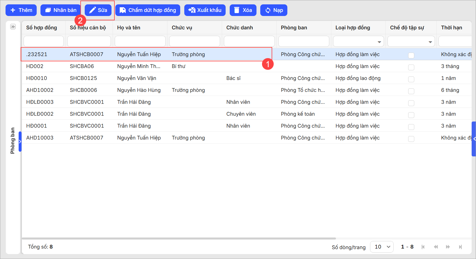 - Chọn hợp đồng của CBCCVC cần sửa trên danh sách, nhấn Sửa.