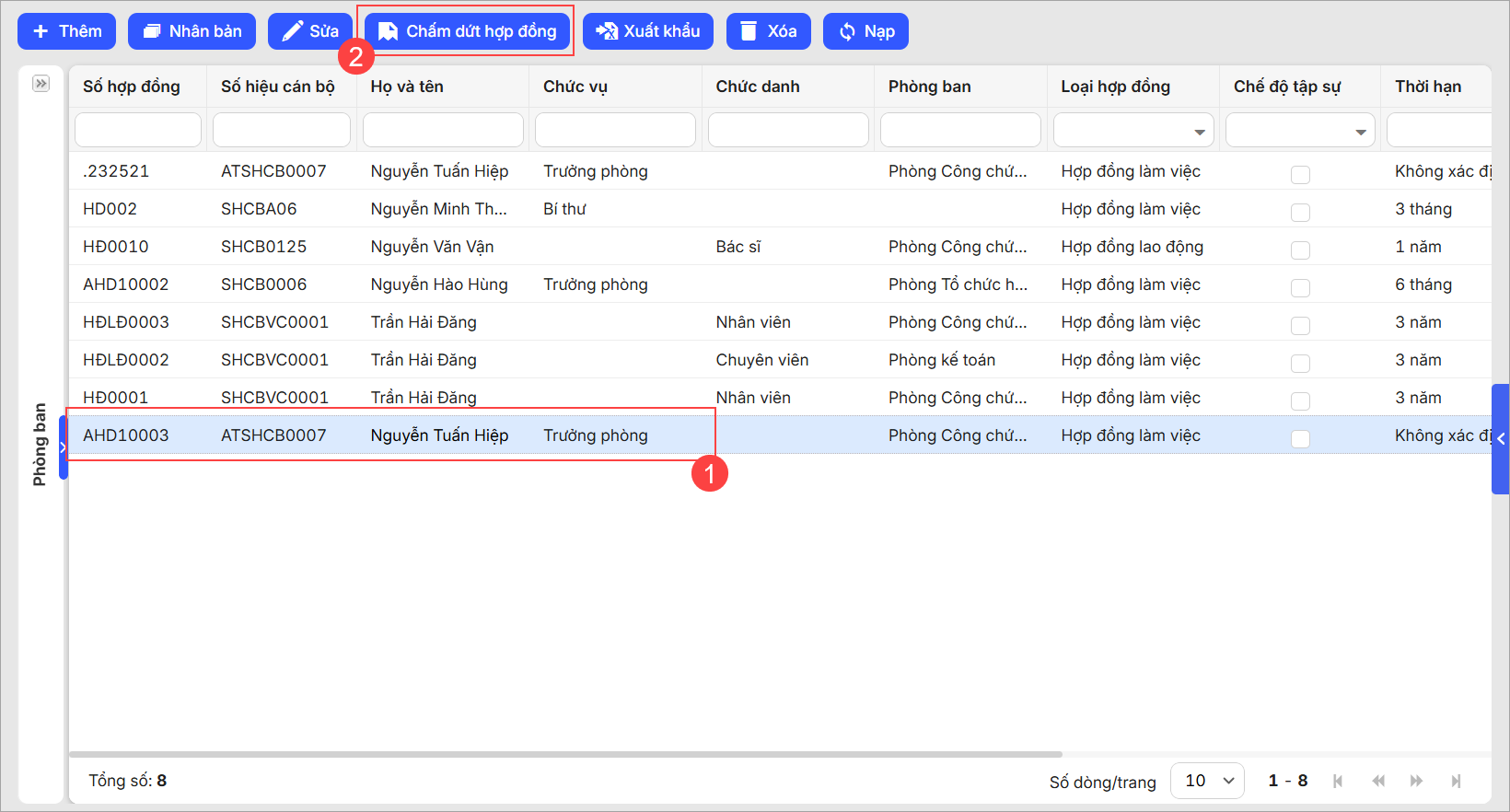 - Chọn hợp đồng của CBCCVC trên danh sách, nhấn Chấm dứt hợp đồng.