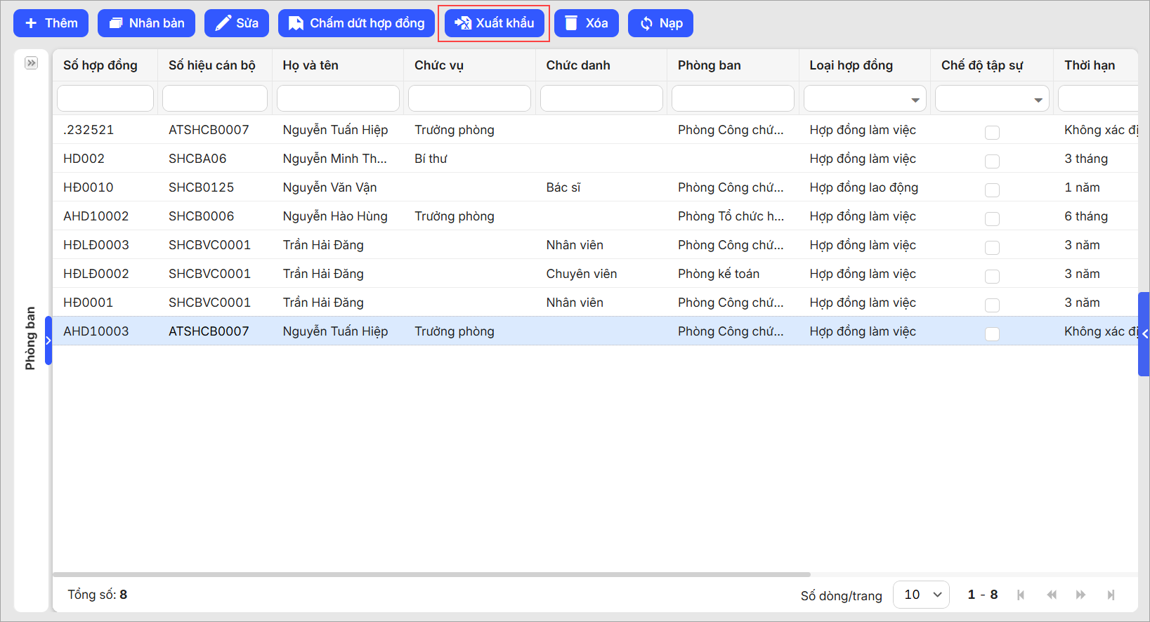 - Chọn hợp đồng của CBCCVC cần xuất khẩu trên danh sách, nhấn Xuất khẩu.