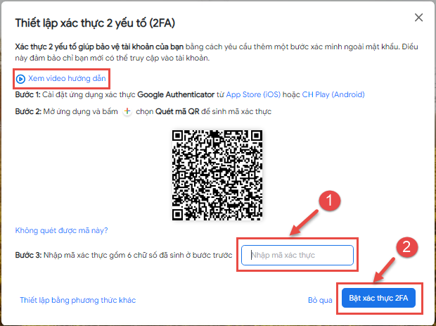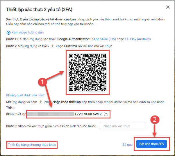 Ngoài ra, anh/chị có thể sử dụng tính năng quét mã QR trên App hoặc Nhập khóa thiết lập để lấy mã xác thực rồi nhấn Bật xác thực 2FA để hoàn tất.