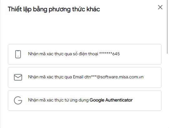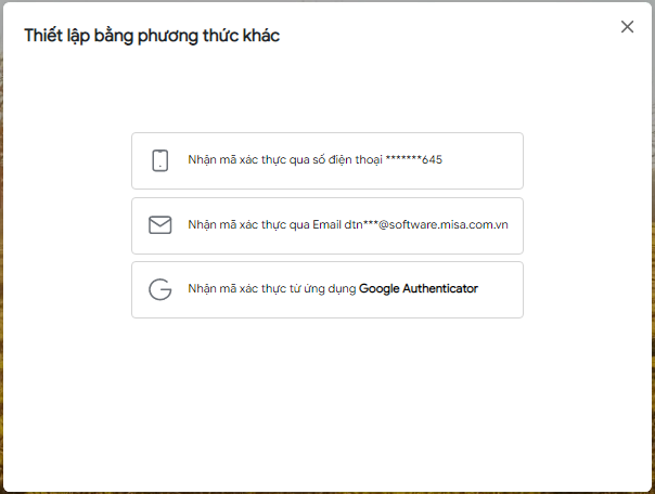 Ngoài ra, khi anh/chị nhấn chọn Thiết lập bằng phương thức khác có thể bổ sung phương thức xác thực khác.