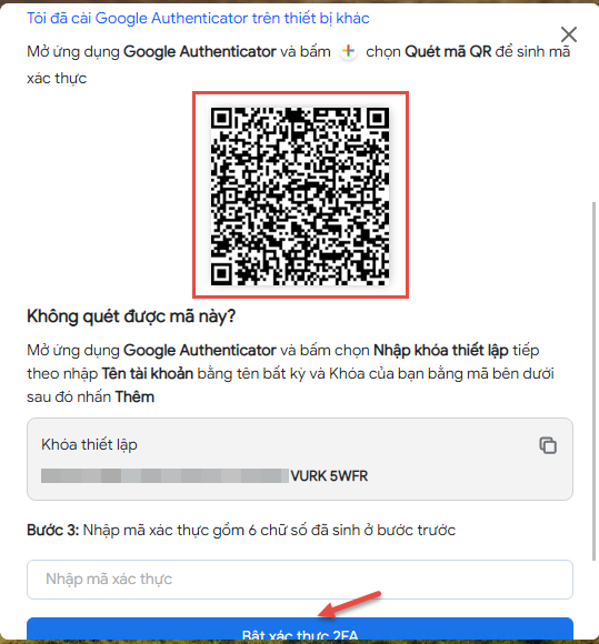 Nếu anh/chị chọn Tôi đã cài Google Authenticator trên thiết bị khác trên màn hình sẽ hiển thị mã QR code và Khóa thiết lập, anh/chị nhập thủ công rồi nhấn chọn Bật xác thực 2FA.