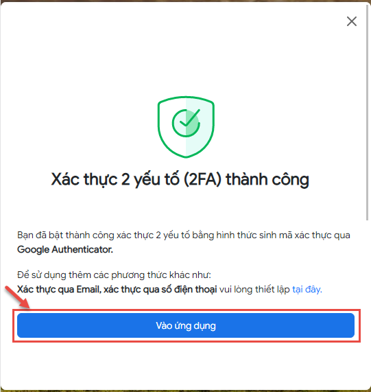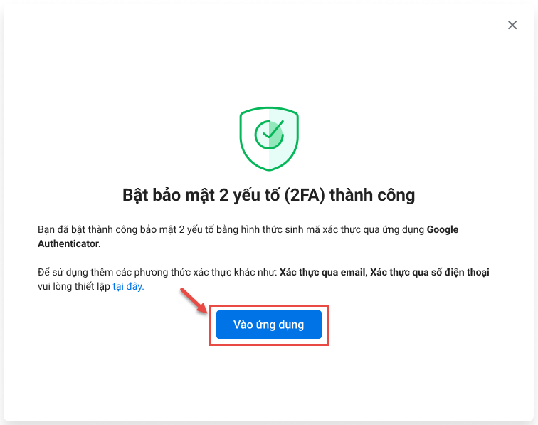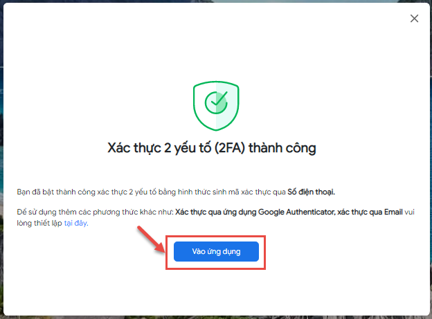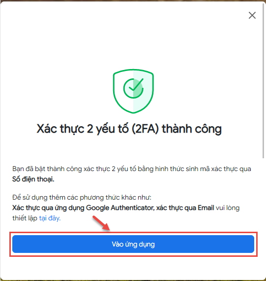 Tương tự các thao tác Thiết lập bảo mật 2FA bằng số điện thoại trên Web và Desktop. Sau khi thiết lập thành công, chọn Vào ứng dụng thì sẽ quay về App mobile tương ứng làm việc tiếp.