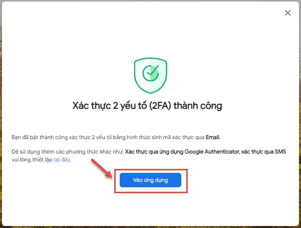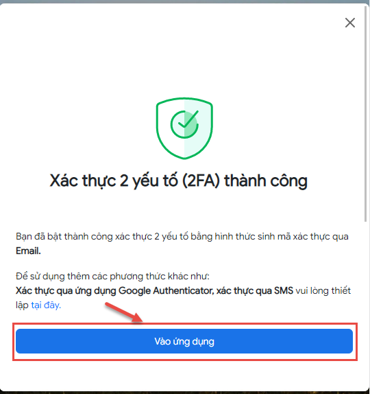 Sau khi thiết lập bảo mật thành công, anh/chị nhấn chọn Vào ứng dụng để đóng thông báo và tiếp tục làm việc.