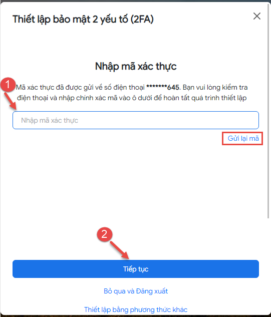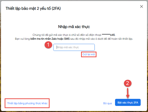 1.3. Thiết lập bảo mật 2FA bằng số điện thoại.