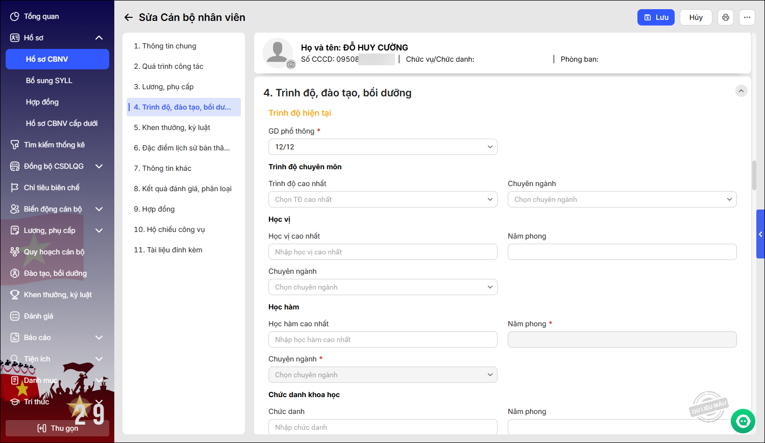 - Nội dung Trình độ hiện tại: Chia thành các cụm thông tin chi tiết bao gồm Trình độ chuyên môn, Học vị, Học hàm, Chức danh khoa học, Trình độ khác.