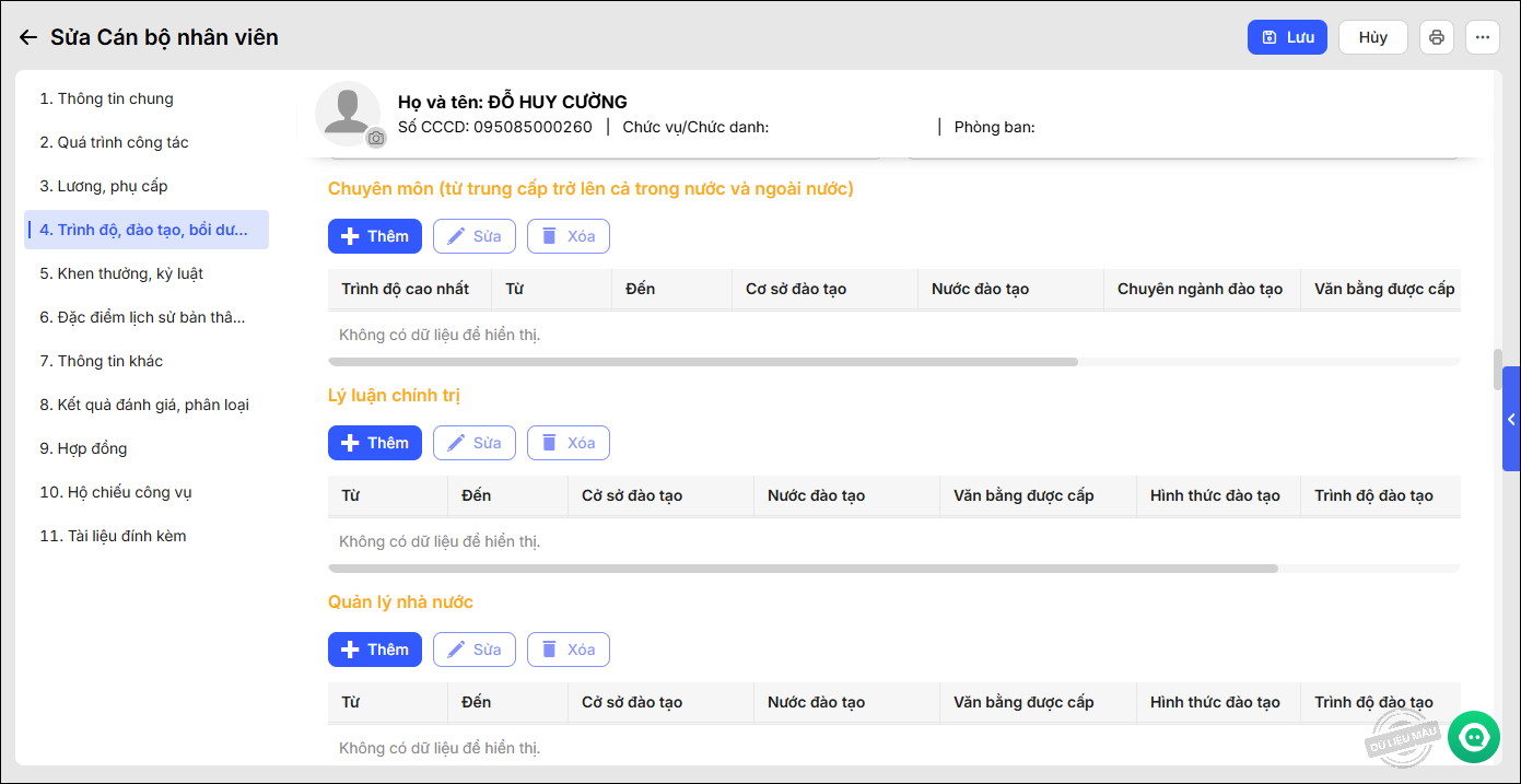 Tại màn hình Hồ sơ\Hồ sơ CBNV, khi thêm hoặc sửa hồ sơ, tại mục 4.Trình độ, Đào tạo, Bồi dưỡng:
